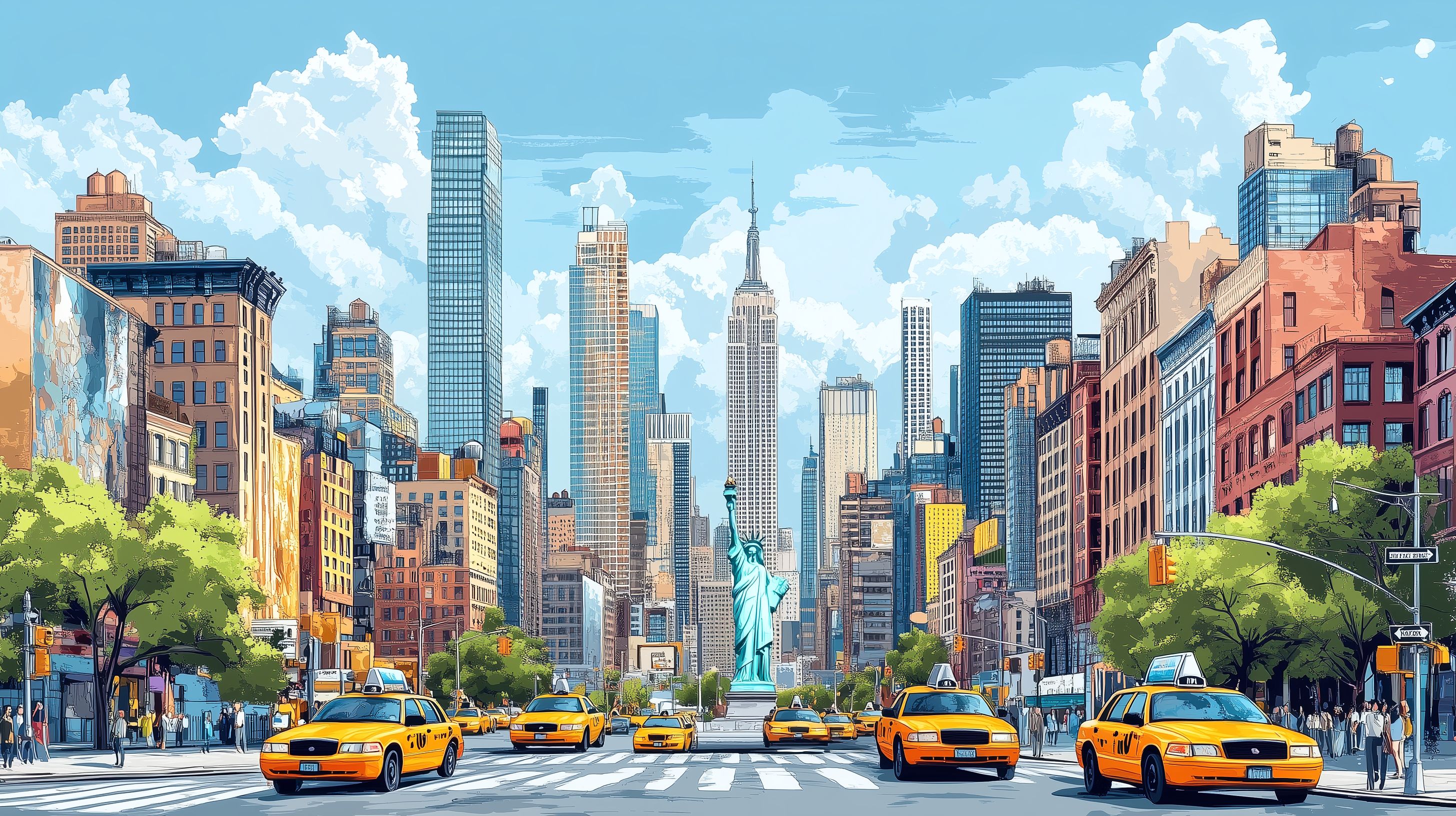 Dieses digitale Illustrationsbild zeigt die ikonische Skyline von New York City mit den charakteristischen Hochhäusern, Wolkenkratzern und der Freiheitsstatue. Im Vordergrund sind gelbe Taxis zu sehen, die den typischen New Yorker Straßenverkehr repräsentieren. Die Szene ist in lebendigen Farben und detaillierten Zeichnungen dargestellt, was eine dynamische und moderne Atmosphäre vermittelt. Das Bild eignet sich hervorragend für den Einsatz in Blogs, Werbekampagnen, Newslettern oder Social-Media-Beiträgen rund um das Thema Großstadt, Tourismus und Geschäftswelt. Als hochwertiges, kostenloses Stockfoto unter Creative-Commons-Lizenz kann es vielseitig und flexibel verwendet werden.