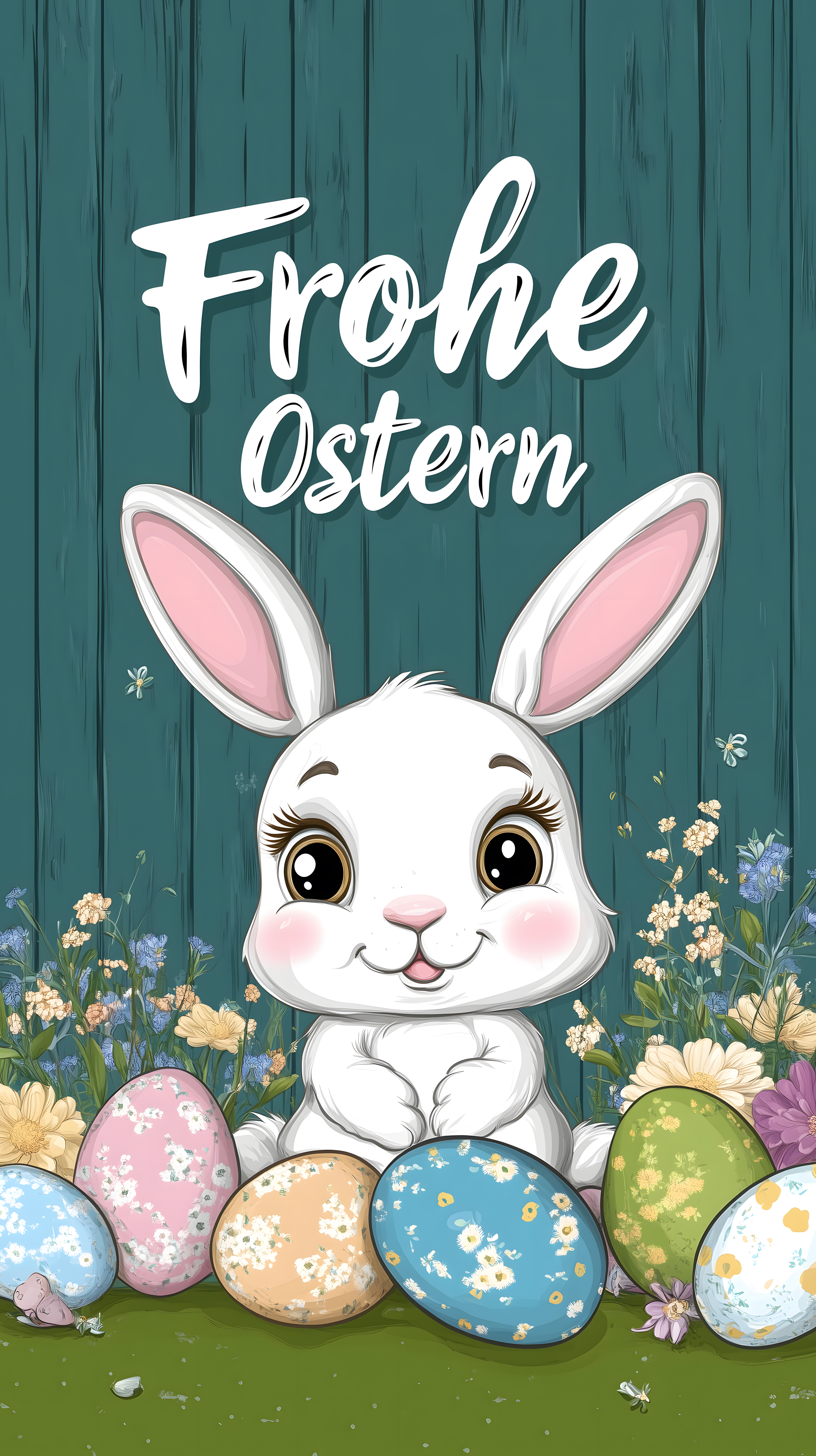 Dieses niedliche Osterbild zeigt einen weißen Osterhasen, umgeben von bunten Ostereiern und Blumen vor einer rustikalen Holzplanken-Kulisse. Der Hase hat große, runde Augen und eine freundliche Mimik, die den Betrachter direkt anblickt. Die Eier sind in verschiedenen Pastelltönen wie Blau, Gelb, Rosa und Grün gehalten und verleihen dem Bild eine fröhliche, frühlinghafte Stimmung. Die zarten Blumen, wie Gänseblümchen und Butterblumen, ergänzen die Szenerie perfekt.