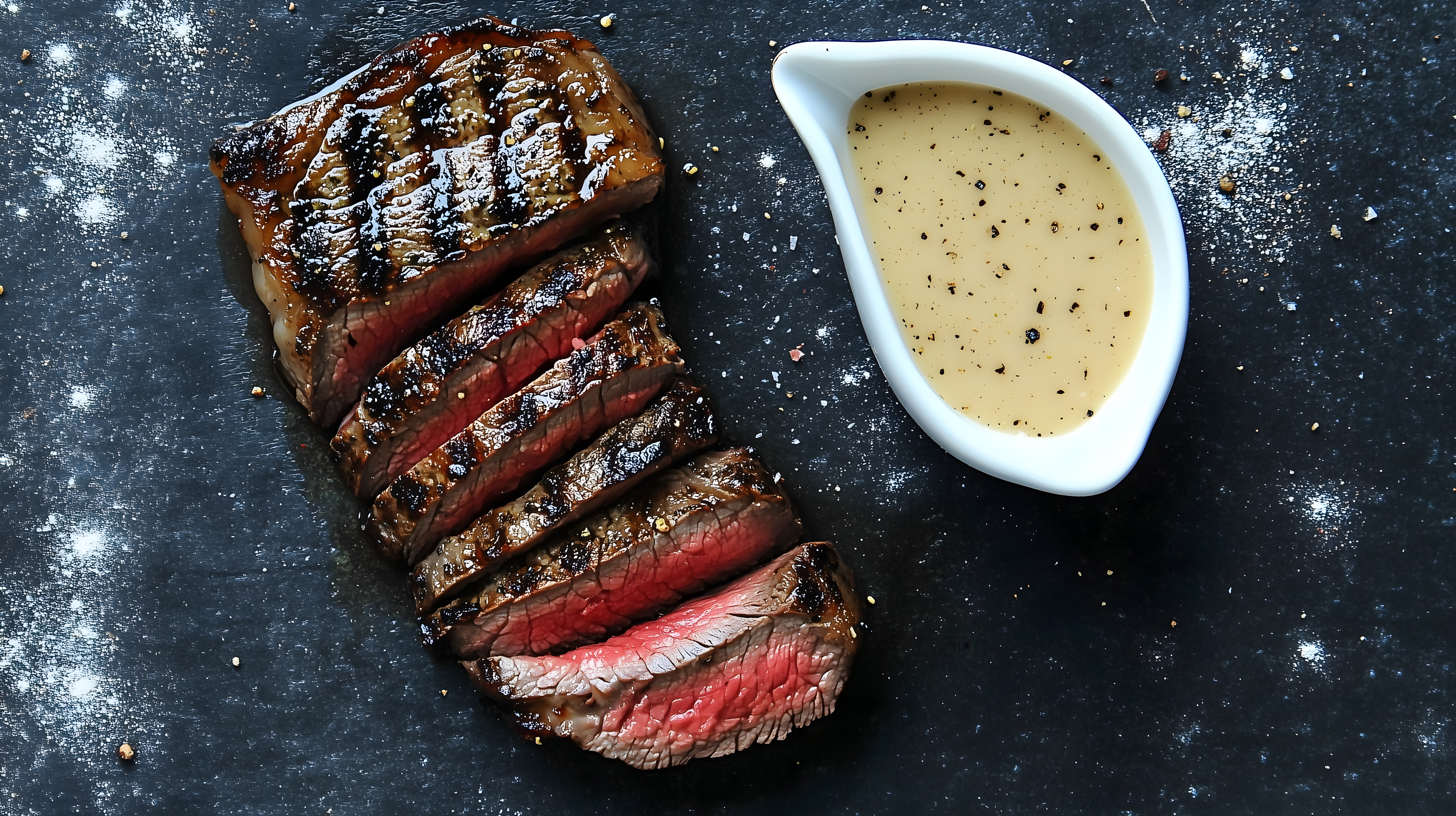 Das Foto zeigt ein saftig gegrilltes Steak, das auf einem dunklen Untergrund angerichtet ist. Das Fleisch ist perfekt rosa in der Mitte und mit einer köstlichen Pfeffersoße serviert. Die Komposition der Aufnahme betont die Textur und Farben des Gerichts, was den Appetit des Betrachters anregt. Dieses Stockfoto eignet sich hervorragend für Rezeptseiten, Restaurantwebsites oder Werbematerialien rund um das Thema Fleisch und Grillen. Es ist in hoher Auflösung verfügbar und kann unter einer Creative-Commons-Lizenz genutzt werden.