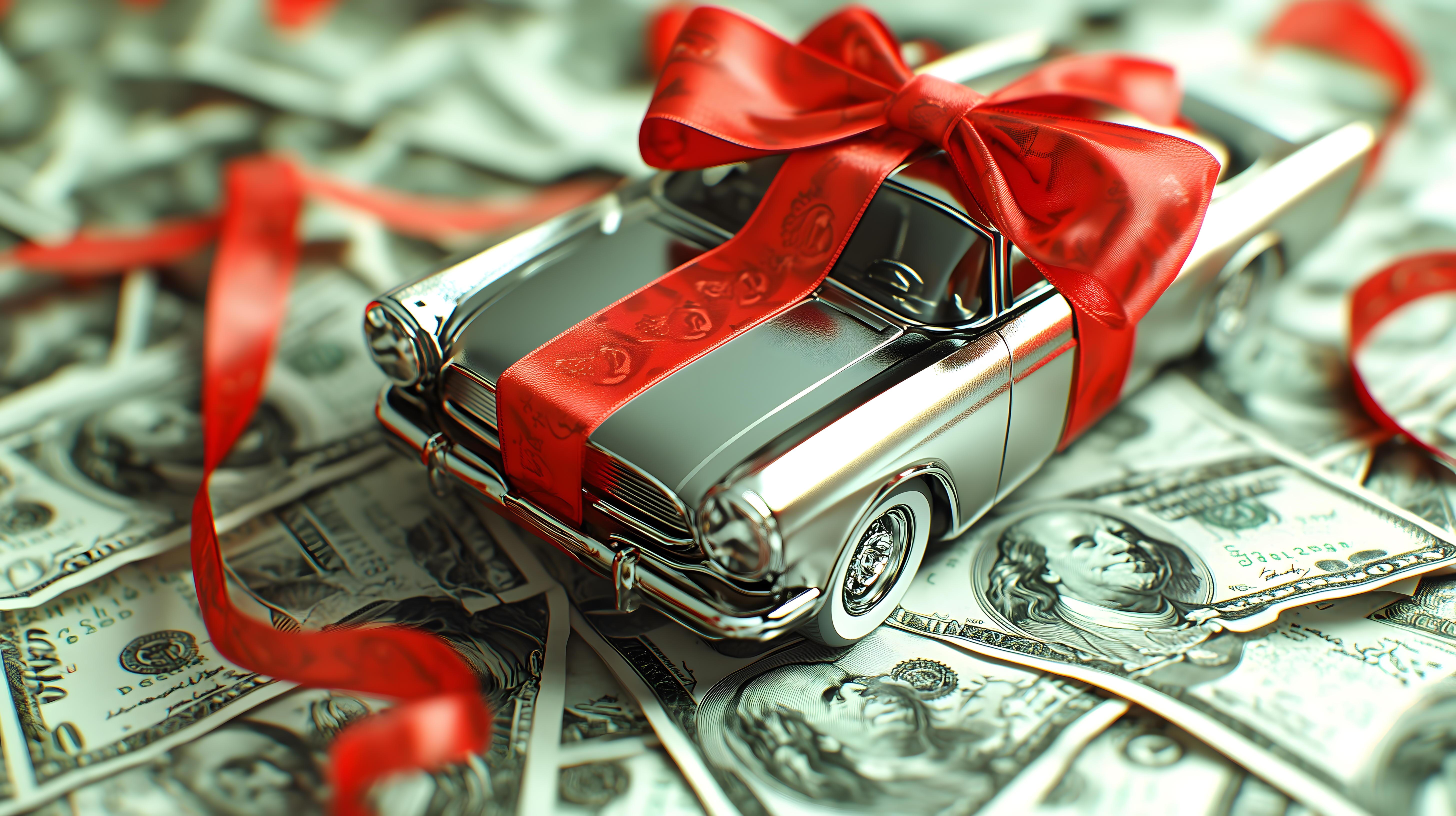 Das Foto zeigt ein nostalgisches Geschenkset bestehend aus einem Oldtimer-Spielzeugauto, das mit einer roten Schleife verziert ist und auf einem Haufen von Geldscheinen platziert ist. Die Szenerie vermittelt ein Gefühl von Luxus, Reichtum und Beschenkung. Das detailliert gestaltete Automodell in Silberfarbe kontrastiert wirkungsvoll mit den grünen Dollarnoten im Hintergrund. Diese Kombination aus Spielzeug und Bargeld lässt verschiedene Interpretationen zu - vom Jubiläumsgeschenk bis hin zur Werbung für ein besonderes Angebot. Das hochauflösende Bild eignet sich hervorragend für den Einsatz in Blogs, Newslettern oder Social-Media-Kanälen und kann dank der Creative-Commons-Lizenz kostenfrei verwendet werden.