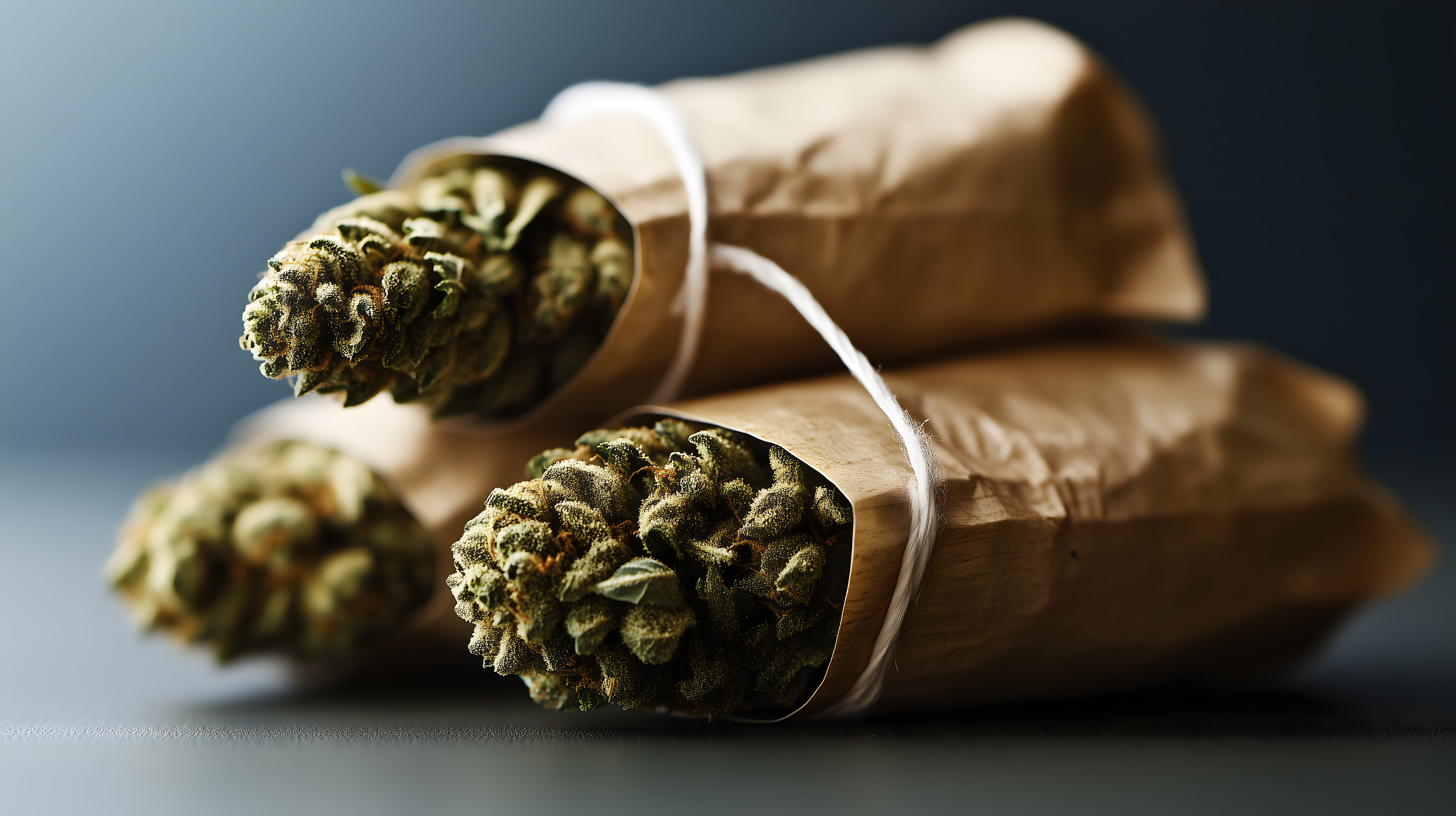 Das Bild zeigt eine Nahaufnahme von Hanfblüten, die in braunes Papier eingerollt sind. Die Blüten haben eine kräftige grüne Färbung mit deutlich sichtbaren Trichomen. Die Anordnung der Rollen auf dem dunklen Hintergrund verleiht dem Motiv eine minimalistisch-stilvolle Ästhetik. Dieses hochauflösende Foto eignet sich hervorragend als kostenloses Stockfoto für Beiträge zum Thema Cannabis, Drogenpolitik, Lifestyle oder Suchtprävention. Es ist unter der Creative Commons-Lizenz frei verwendbar.