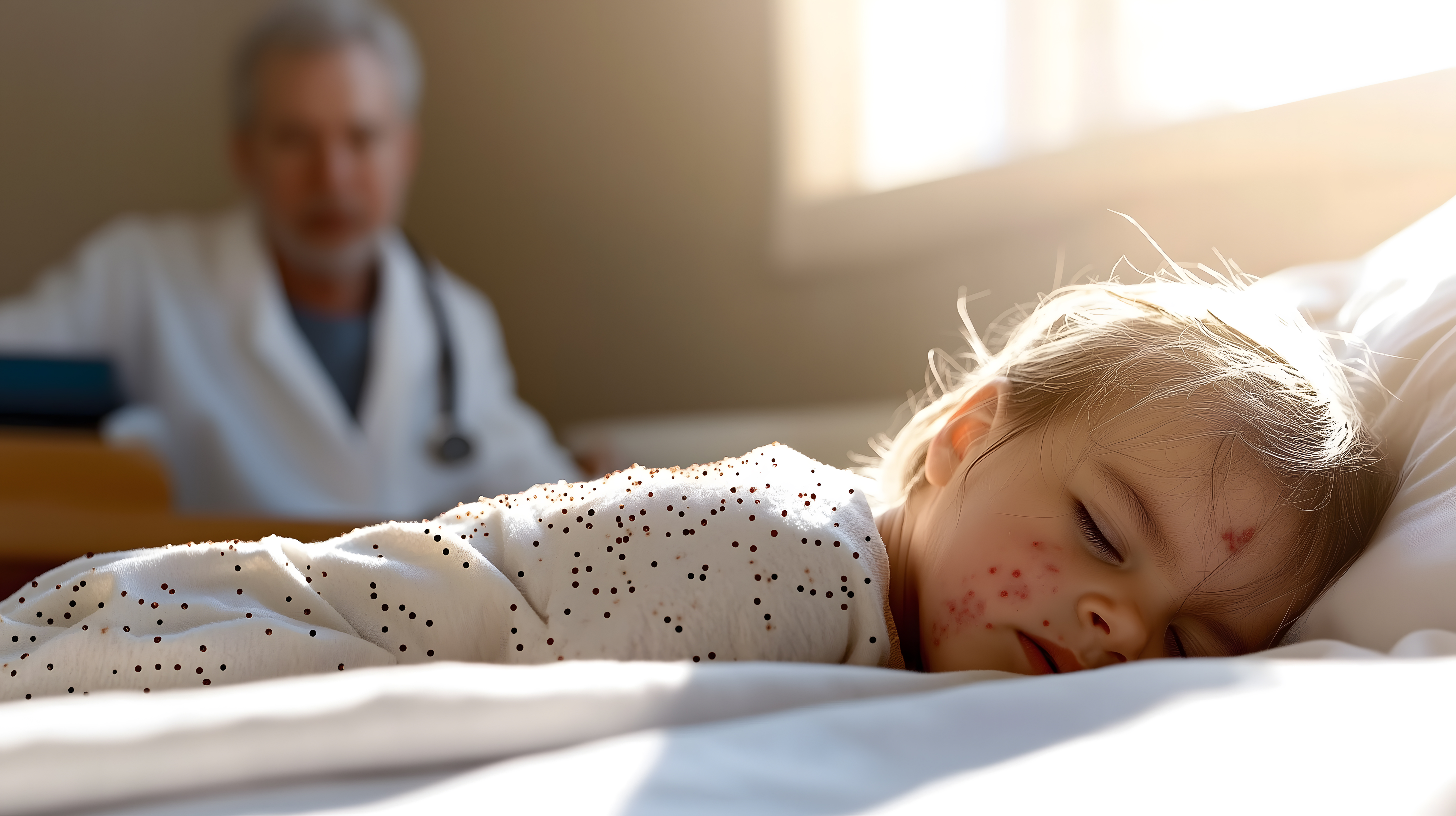 Das Foto zeigt ein krankes Kind, das offensichtlich an einem Hautausschlag, vermutlich Masern, leidet. Das Kind liegt in einem Bett und sieht müde und krank aus. Im Hintergrund ist ein Arzt zu sehen, der sich um das Kind kümmert. Das Foto vermittelt ein Gefühl von Fürsorge und Besorgnis, da das Kind Hilfe und Behandlung benötigt. Die natürliche Beleuchtung durch das Fenster gibt dem Bild eine ruhige, fast intime Atmosphäre. Dieses Stockfoto könnte in Artikeln oder Werbekampagnen zu den Themen Gesundheit, Krankheit, Kindermedizin oder Fürsorglichkeit verwendet werden. Es ist in hoher Auflösung verfügbar und kann unter einer Creative Commons-Lizenz genutzt werden.