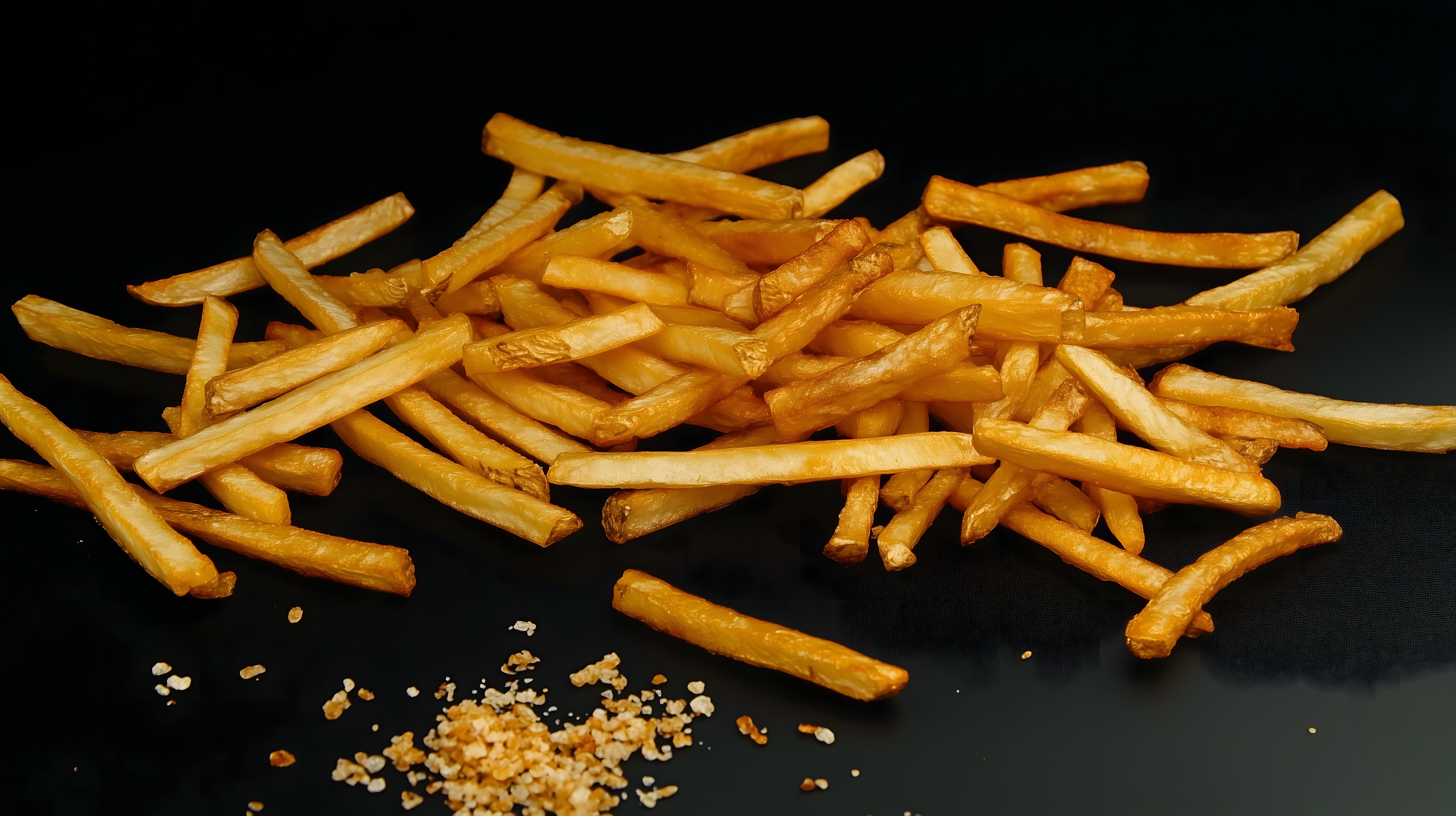 Dieses Foto zeigt eine Vielzahl knuspriger, goldbrauner Pommes frites auf schwarzem Hintergrund. Die Anordnung der Pommes frites ist ungeordnet, was einen natürlichen, appetitlichen Eindruck vermittelt. Der starke Kontrast zwischen den warmen Farbtönen der Pommes und dem dunklen Hintergrund erzeugt eine klare, reduzierte Optik. Dieses hochauflösende Stockfoto eignet sich hervorragend für den Einsatz in Werbung, Marketing, Web-Design, Social-Media-Beiträgen oder Newslettern. Es ist unter einer Creative-Commons-Lizenz frei nutzbar.