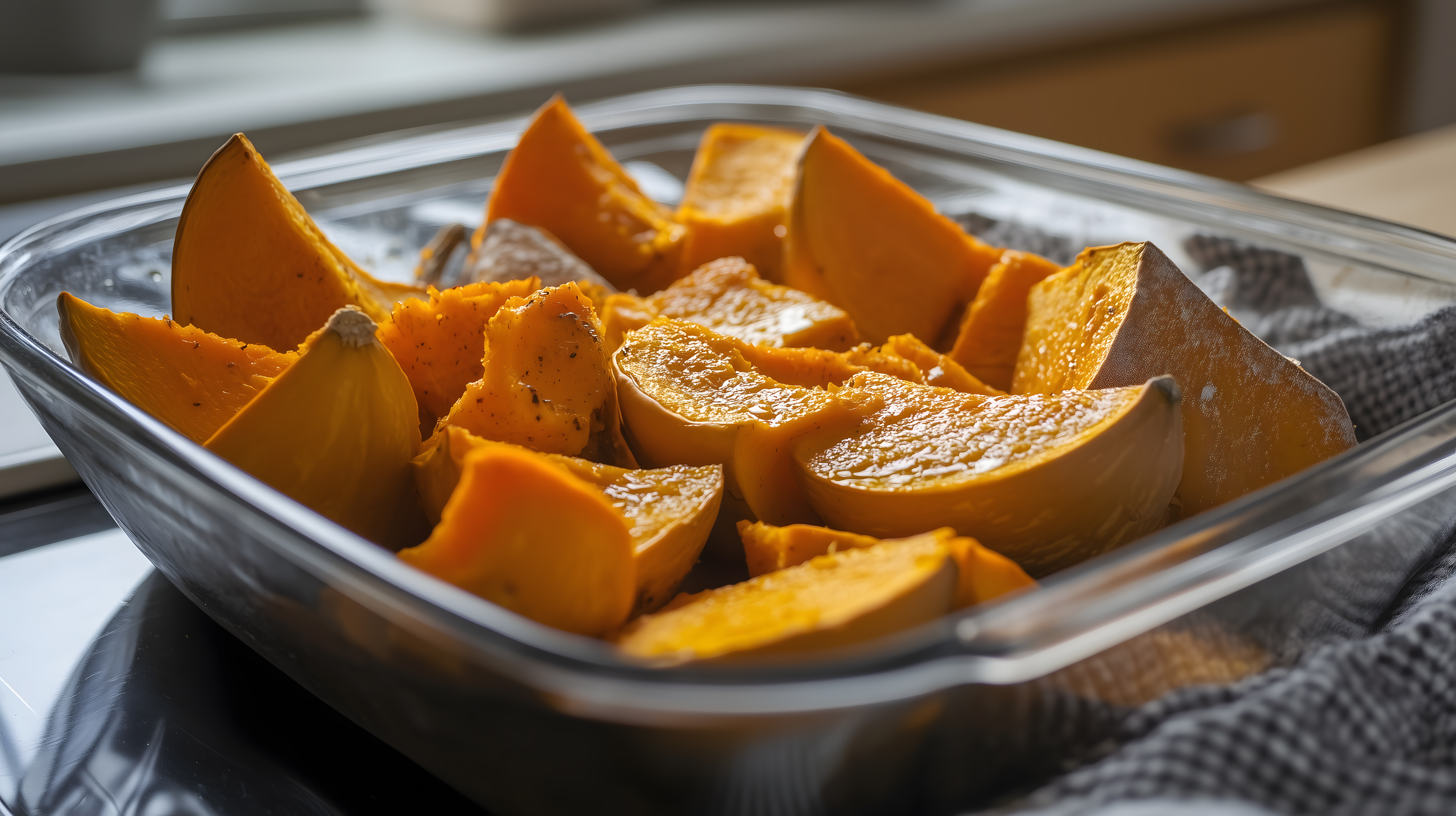 Dieses appetitliche Foto zeigt ofengebratene Kürbis-Scheiben in einer Glasschale. Die würfelförmigen Kürbisgucker haben eine kräftig-orangene Farbe und eine appetitliche Anordnung in der Schüssel. Das Bild strahlt eine gesunde, herbstliche Atmosphäre aus und eignet sich ideal für Rezepte, Foodblogs, Werbung für Saisonkost oder andere Lebensmittel-Präsentationen. Als hochwertiges, kostenloses Stockfoto unter Creative-Commons-Lizenz kann es vielseitig in Print- und Onlinemedien eingesetzt werden.
