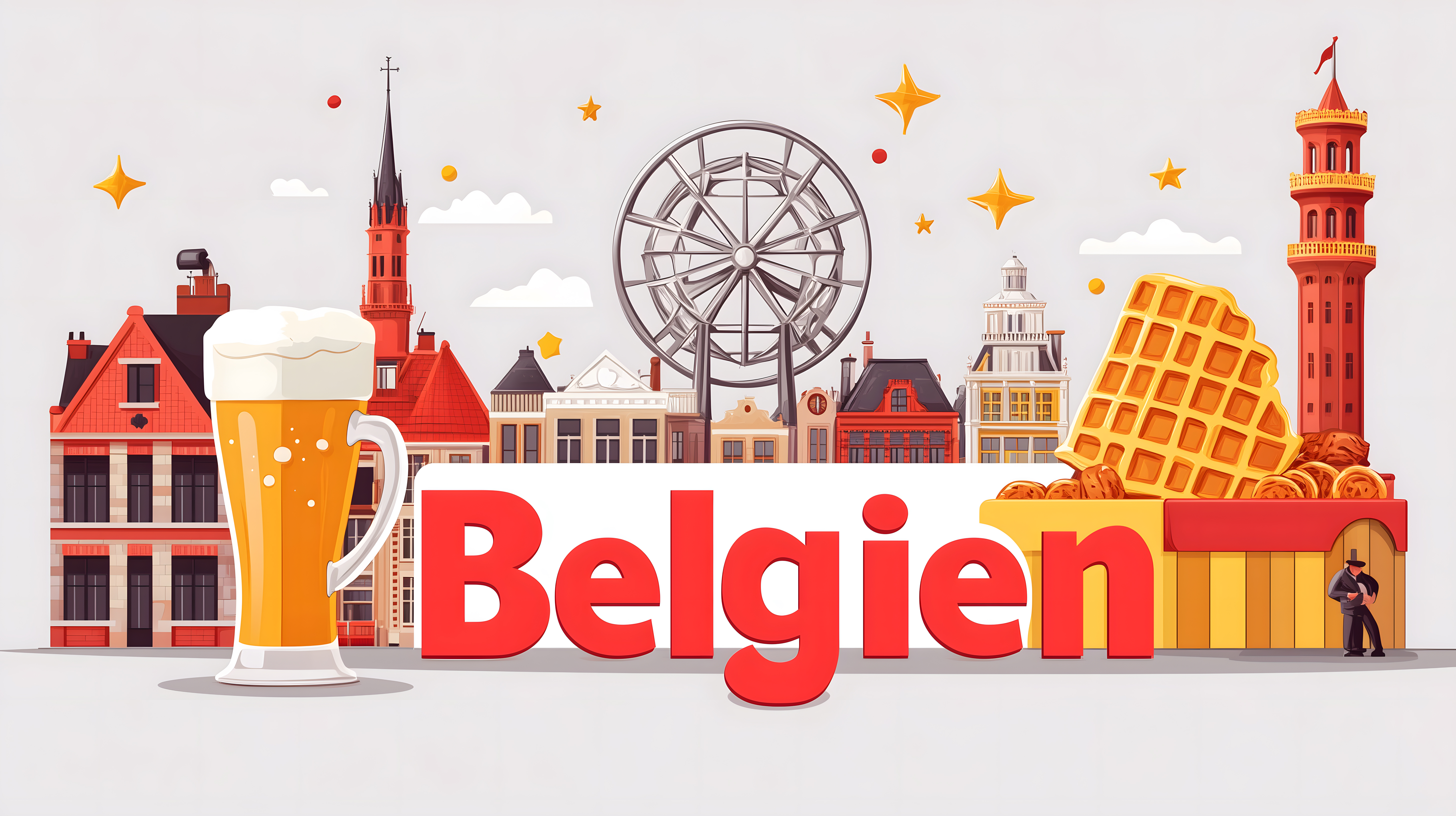 Dieses farbenfrohe Stockfoto zeigt eine illustrative Darstellung der belgischen Kultur und Identität. Im Zentrum steht der geschriebene Schriftzug 'Belgien', umgeben von ikonischen Elementen wie historischen Gebäuden, traditionellen Waffeln, einem Bierkrug sowie einem Riesenrad als Wahrzeichen. Die Illustration zeichnet sich durch eine bunte, stilisierte Ästhetik aus und vermittelt den Charakter des belgischen Landes in einem einzigartigen visuellen Stil. Ideal für Verwendung in Tourismus-Materialien, Reiseführern, Blogbeiträgen oder Social-Media-Posts rund um Belgien. Dieses hochauflösende Stockfoto steht unter einer Kreativlizenz zur Verfügung.