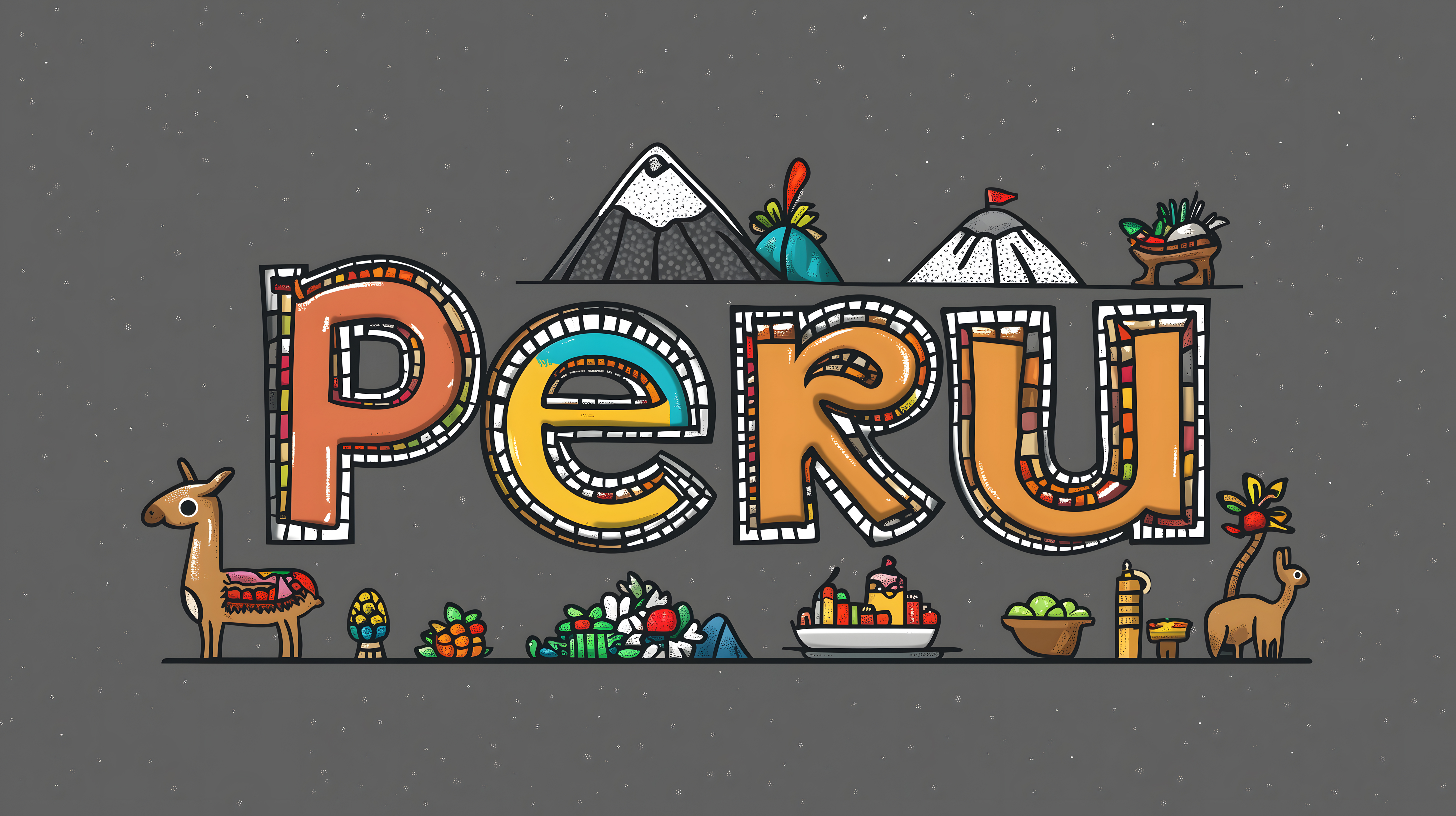 Die lebendige Illustration zeigt eine farbenfrohe Szene, die typische Elemente der peruanischen Kultur und Landschaft vereint. Im Vordergrund befinden sich stilisierte Lamas, umgeben von geometrischen Mustern, Blumen und Früchten. Im Hintergrund ragen auffällige, schneebedeckte Berge hervor, die die Silhouette der Illustration prägen. Die Komposition aus verschiedenen Farben, Formen und Motiven schafft einen dekorativen, folkloristischen Gesamteindruck, der an handgefertigtes Kunsthandwerk erinnert.