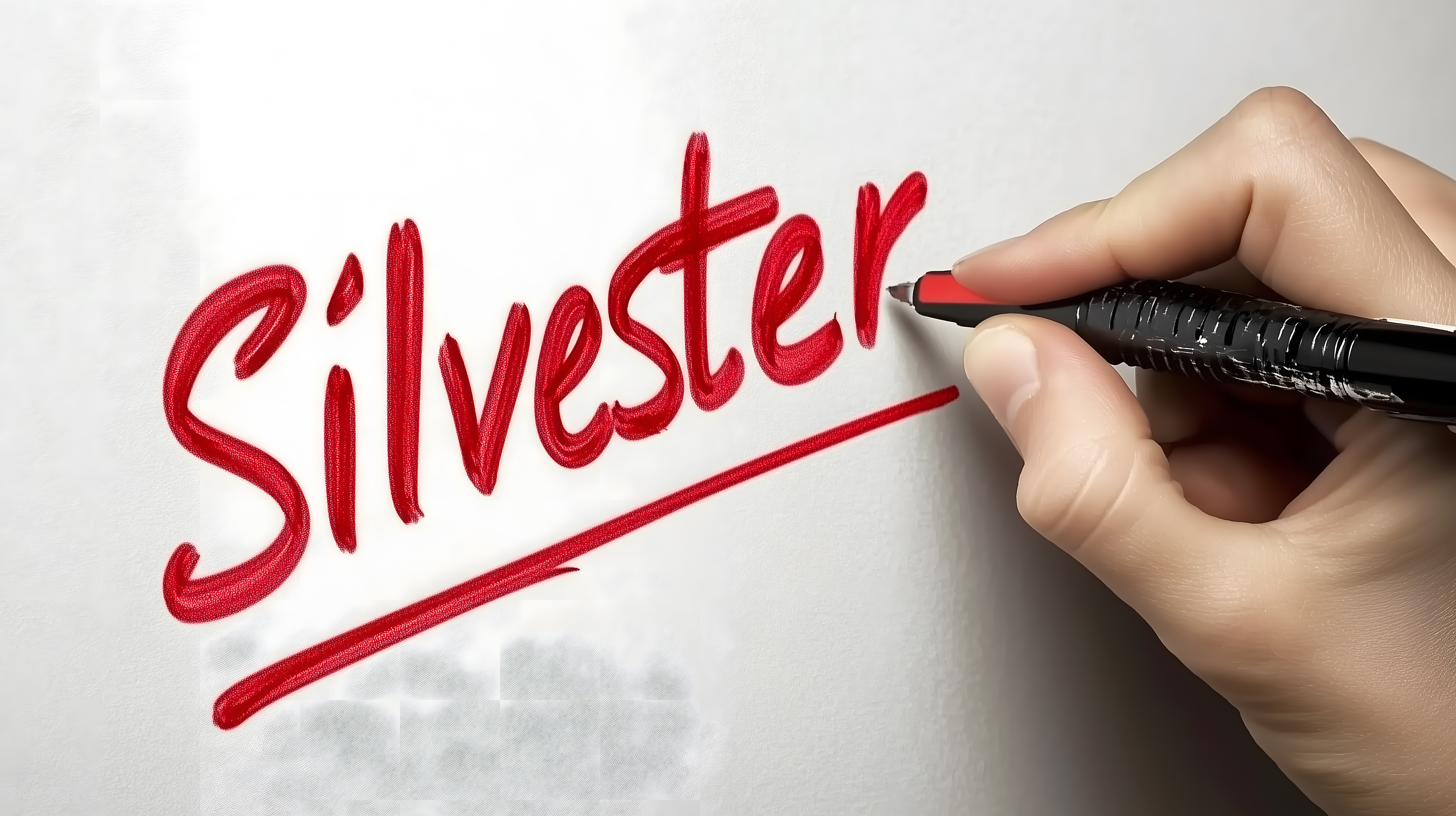 Dieses Bild zeigt eine rote Silvester-Kalligraphie auf weißem Hintergrund. Eine Hand mit einem schwarzen Stift schreibt den Schriftzug 'Silvester' in eleganter Handschrift. Das Motiv eignet sich hervorragend für Neujahrskarten, Weihnachtskarten, Neujahrs-Dekor, Blogbeiträge und Social-Media-Posts rund um die Jahreswende. Das hochauflösende Foto ist unter einer Creative-Commons-Lizenz erhältlich und kann kostenlos für verschiedene Zwecke genutzt werden.