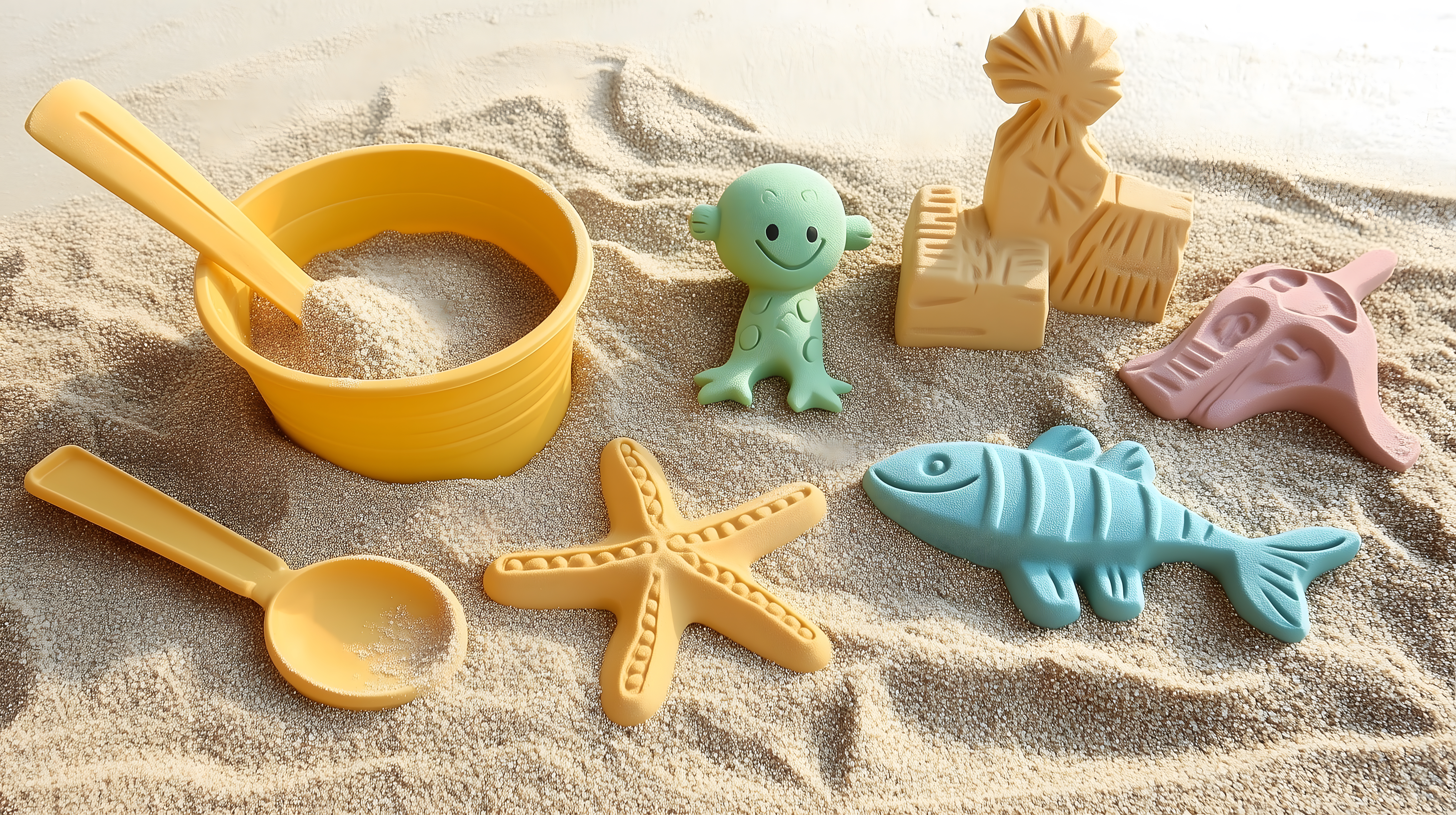 Dieses Bild zeigt eine bunte Auswahl an Sandspielzeugen, die auf einer sandigen Oberfläche verteilt sind. Im Vordergrund befindet sich ein gelber Eimer sowie eine Schaufel, die vermutlich zum Formen und Bauen von Sandkastenfiguren verwendet werden. Daneben befinden sich verschiedene Meeresfiguren wie ein Seestern, ein Dinosaurier und ein Fisch, die die Urlaubsstimmung am Strand wiederspiegeln. Die pastellfarbenen Töne und die weiche Beleuchtung verleihen dem Bild eine entspannte, fast nostalgische Atmosphäre. Dieses Stockfoto in hoher Auflösung eignet sich perfekt für Urlaubsblogs, Reisekataloge, Sommerdekorationen oder Werbeanzeigen für Strandurlaub und Familienaktivitäten. Es steht unter einer Creative-Commons-Lizenz zur Verfügung.