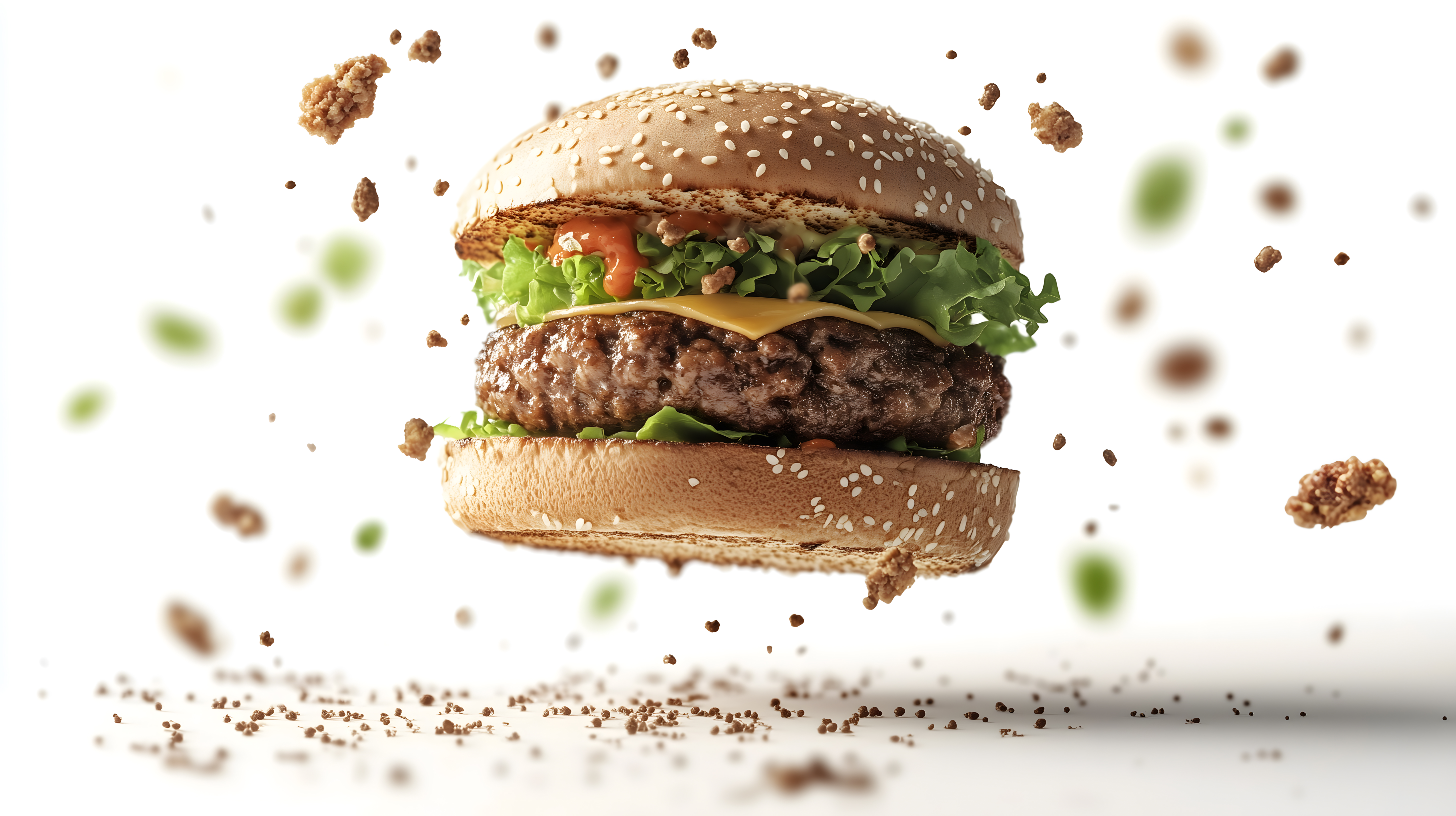Das Bild zeigt einen appetitlichen Hamburger, der über verschiedenen Zutaten wie Salat, Tomaten und Gewürzen schwebt. Der Burger ist mittig platziert und fängt den Blick des Betrachters ein. Die hochauflösende und realistische Darstellung lässt den Burger beinahe greifbar erscheinen und weckt Appetit. Dieses Stockfoto eignet sich hervorragend für den Einsatz in Werbung, Foodblogs oder Rezeptsammlungen rund um Fast Food. Es ist unter einer Creative-Commons-Lizenz verfügbar und in hoher Auflösung kostenlos herunterladbar.