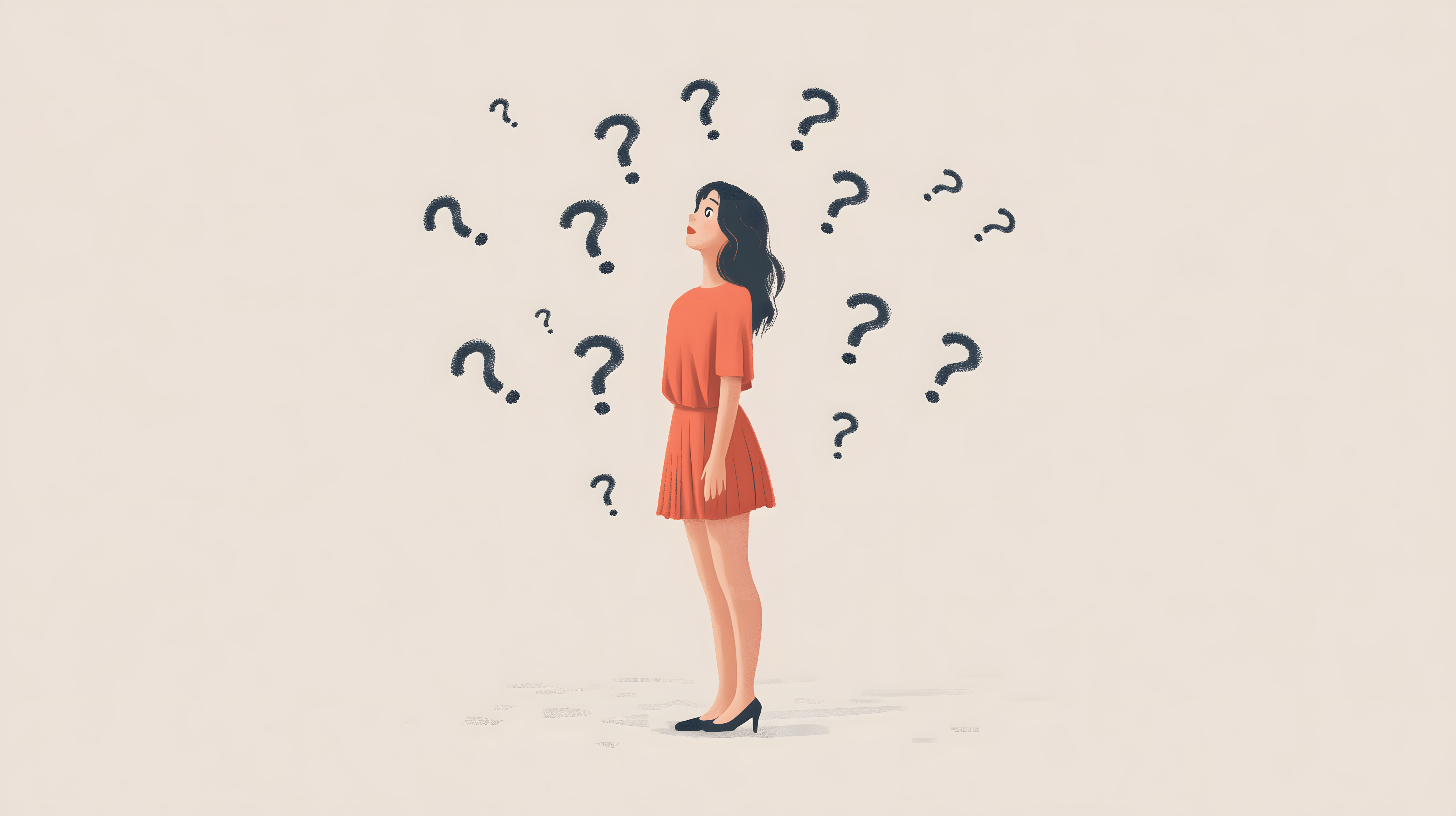 Das Bild zeigt eine nachdenkliche Frau in einem roten Kleid, die von Fragezeichen umgeben ist. Ihre Körpersprache und Gesichtsausdruck deuten auf Unentschlossenheit und Zweifel hin. Dieses Konzeptbild eignet sich hervorragend für Themen wie Entscheidungsfindung, Problemlösung, Beratung oder Geschäftsideen. Es kann in Blogbeiträgen, Newslettern, Social-Media-Posts oder Werbekampagnen eingesetzt werden. Das hochauflösende, lizenzfreie Stockfoto ist unter Creative-Commons-Lizenz verfügbar und kann kostenfrei für verschiedene Projekte genutzt werden.