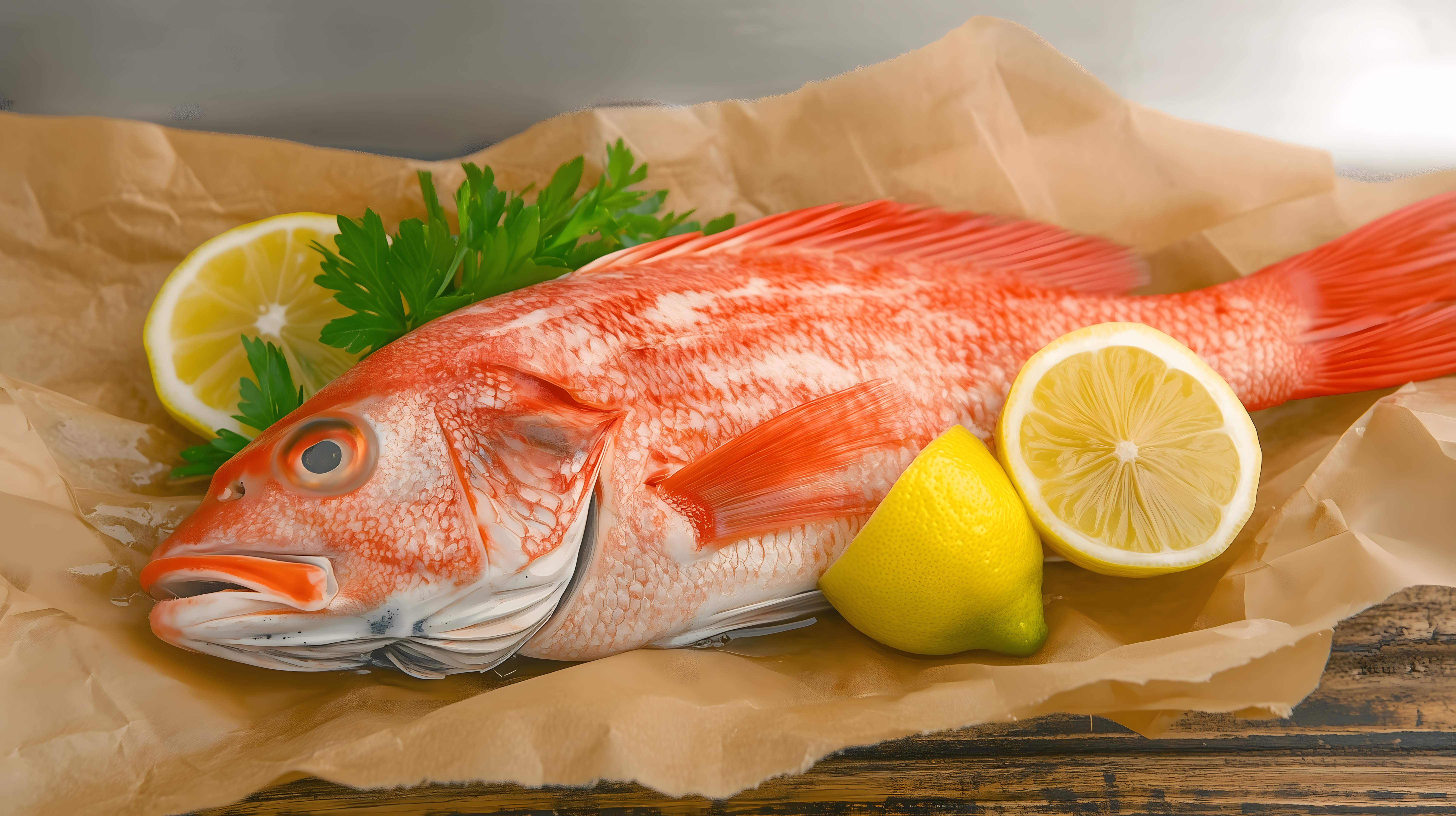 Das Bild zeigt einen frischen Rotbarsch, der auf einer rustikalen Papierunterlage platziert ist. Der Fisch hat eine kräftige, leuchtend rote Farbe und ist mit einer Zitronenhälfte und frischen Kräutern dekoriert. Die Kombination der natürlichen Elemente auf dem schlichten Papiergrund erzeugt einen stimmungsvollen, appetitlichen Eindruck. Dieses hochauflösende Stockfoto eignet sich hervorragend für Blogs, Newsletter, Social-Media-Beiträge oder andere Werbeanwendungen im Bereich Gastronomie, Kochen und gesunde Ernährung. Es steht unter einer Creative-Commons-Lizenz kostenfrei zur Verfügung.