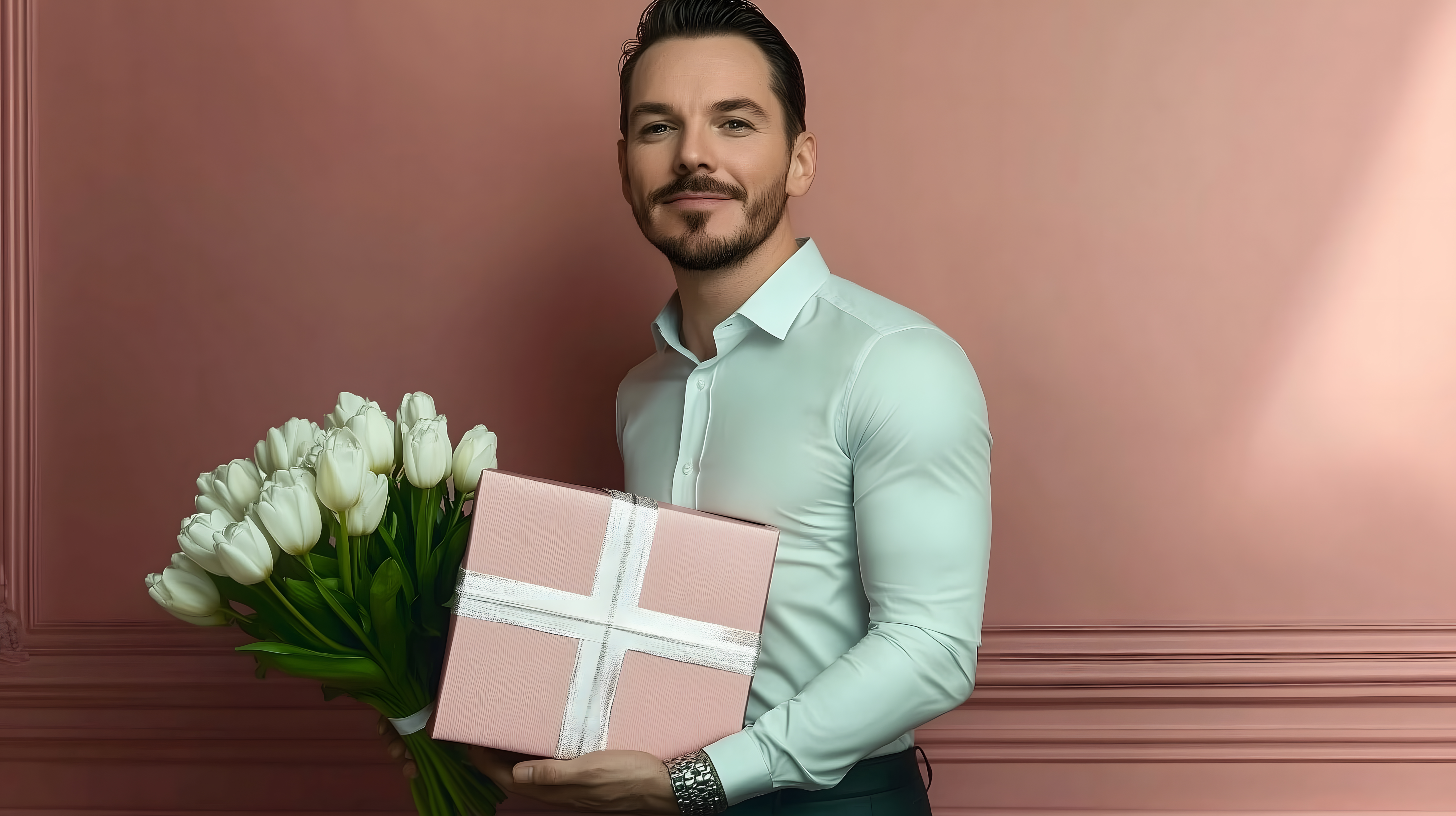 Das Bild zeigt einen attraktiven Mann, der einen Strauß weißer Tulpen und eine rosa Geschenkbox hält. Er steht vor einer pastellfarbenen Rosawand und lächelt freundlich in die Kamera. Das Foto eignet sich hervorragend für Werbung, Social-Media-Posts oder redaktionelle Beiträge rund um Themen wie Valentinstag, Muttertag oder Geburtstag. Das hochauflösende Stockfoto steht unter einer Creative-Commons-Lizenz kostenlos zur Verfügung.