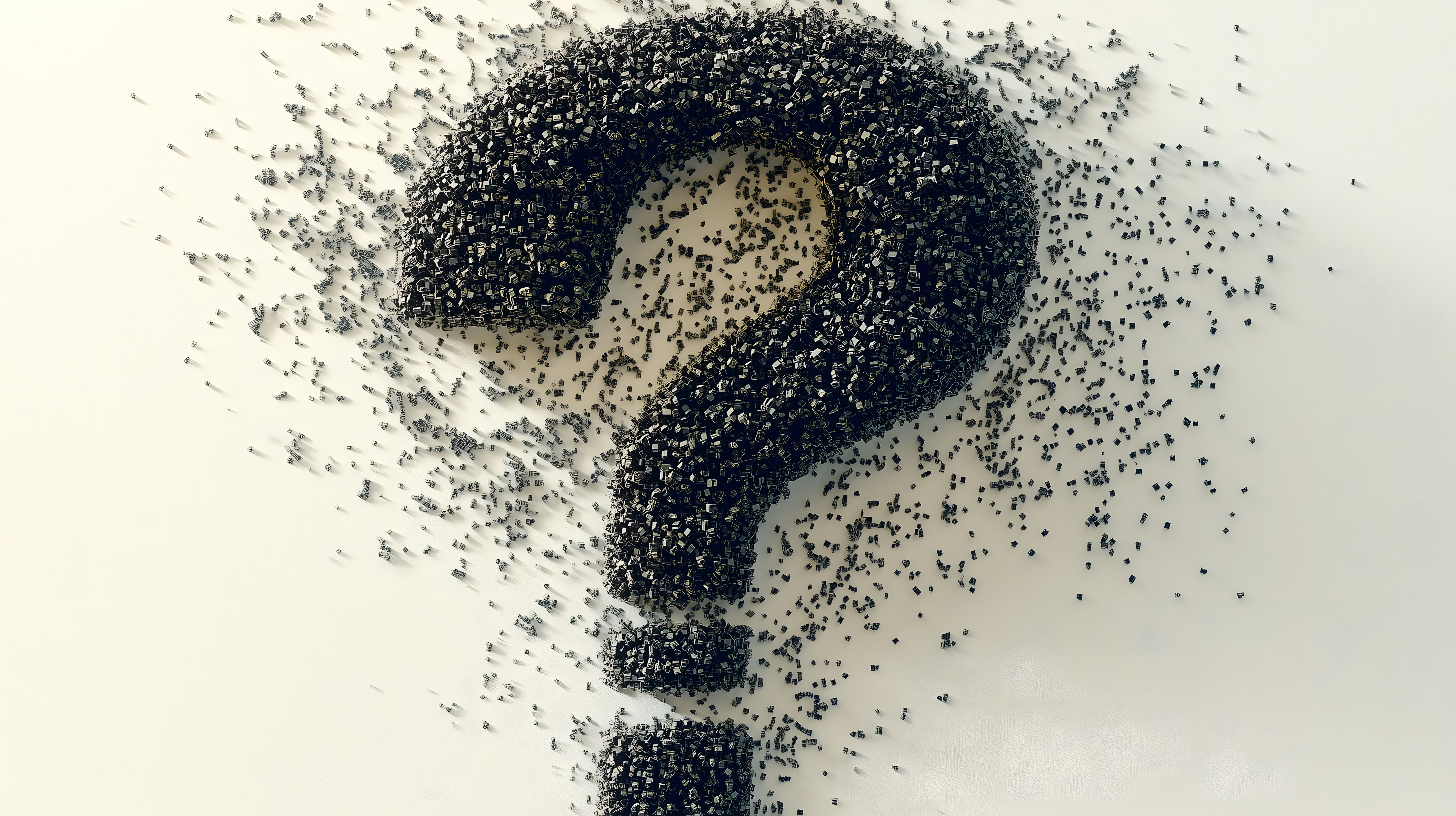 Dieses Foto zeigt ein abstraktes Fragezeichen, das aus unzähligen kleinen dunklen Partikeln auf einem hellen Hintergrund gebildet wird. Die Partikel haben eine unregelmäßige, körnige Struktur, die dem Fragezeichen eine faszinierende, mysteriöse Ausstrahlung verleiht. Die geometrische Form des Fragezeichens kontrastiert reizvoll mit der ungeordneten Anordnung der Partikel, was eine spannungsvolle, nachdenkliche Stimmung erzeugt. Dieses Stockfoto eignet sich hervorragend für den Einsatz in Blogbeiträgen, Newslettern, Werbeanzeigen oder Social-Media-Posts, die sich mit Themen wie Kreativität, Innovation, Problemlösung oder Unsicherheit befassen. Aufgrund seiner hohen Auflösung und Lizenzfreiheit kann es kostenfrei für verschiedenste Zwecke genutzt werden.