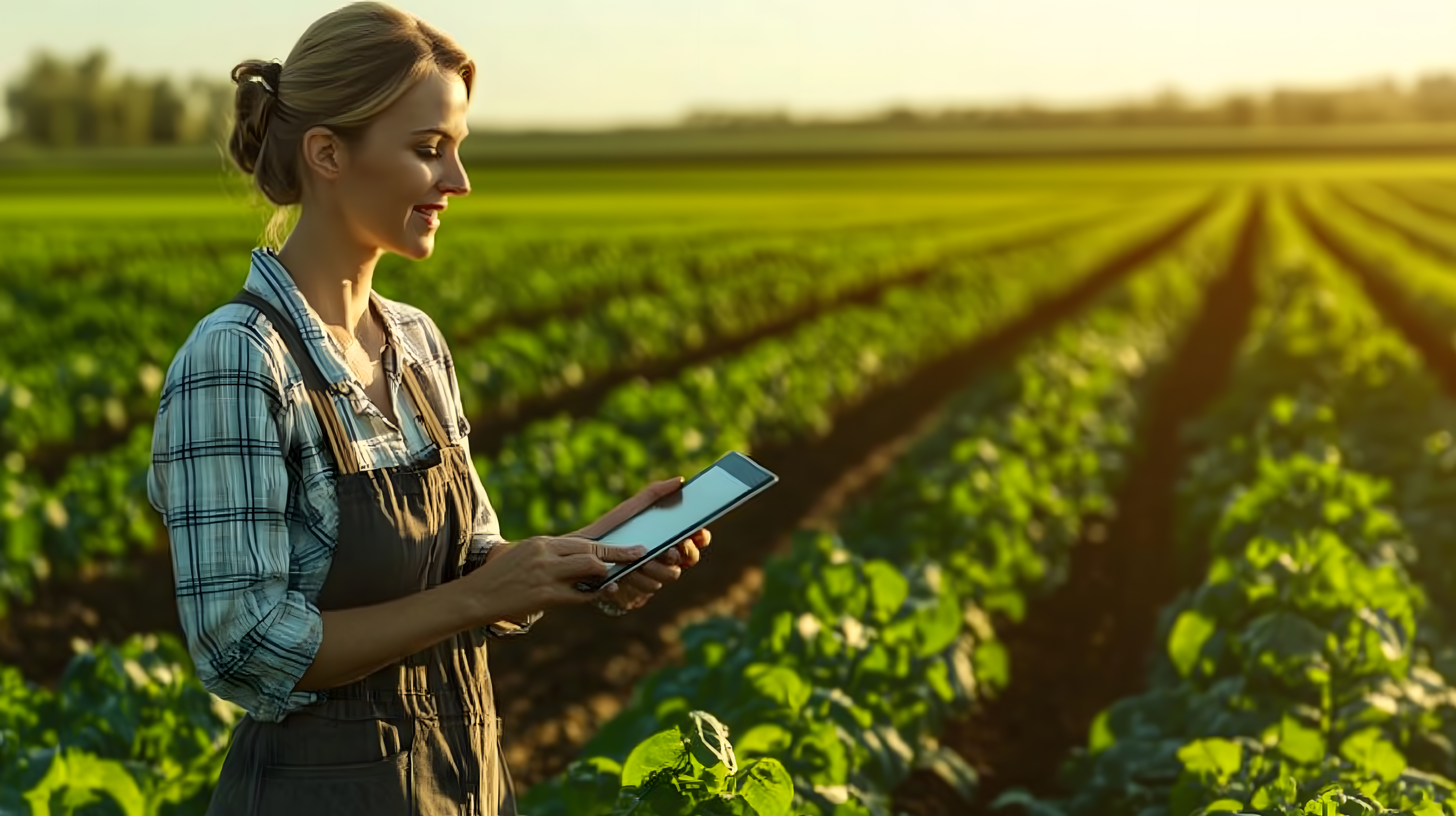 Das Foto zeigt eine moderne Landwirtin, die in einem grünen Getreidefeld steht und einen Tablet-PC in der Hand hält. Sie scheint die neuesten digitalen Technologien in ihrer landwirtschaftlichen Praxis einzusetzen, um die Effizienz und Nachhaltigkeit ihres Betriebs zu steigern. Die Szene ist von einem warmen Sonnenuntergang beleuchtet, was eine friedliche und idyllische Stimmung vermittelt.