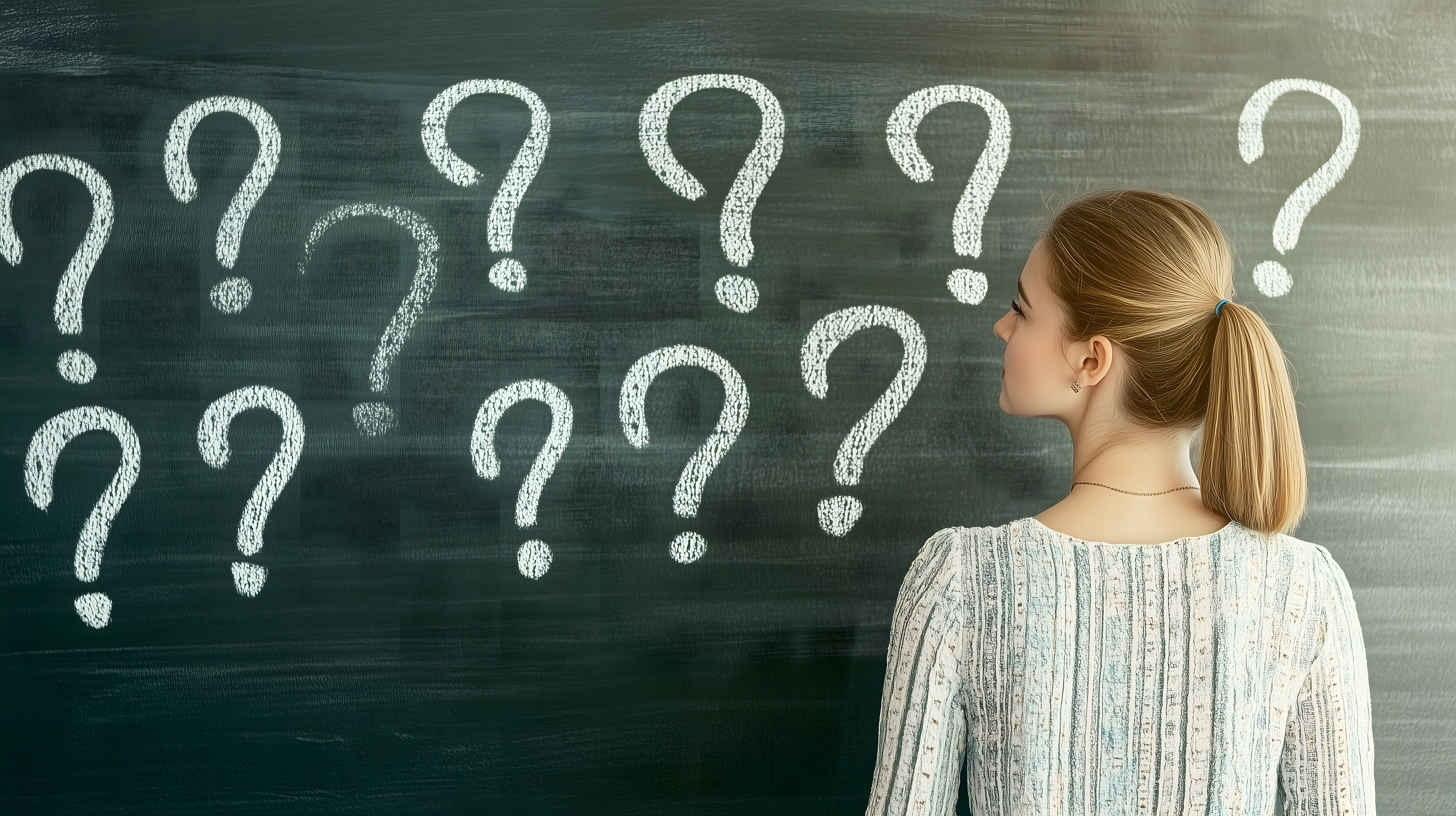 Das Bild zeigt eine nachdenkliche, blonde Frau, die von hinten zu sehen ist und auf eine Tafel blickt, auf der zahlreiche Fragezeichen geschrieben stehen. Die Frau scheint in Gedanken versunken und sucht nach Lösungen oder Antworten auf die dargestellten Fragen. Das Motiv vermittelt eine Stimmung der Unsicherheit, Konzentration und Kreativität und eignet sich gut für Blogbeiträge, Newsletter-Illustrationen oder Social-Media-Posts rund um Themen wie Entscheidungsfindung, Problemlösung oder Bildung. Dieses hochauflösende Stockfoto ist unter einer Creative-Commons-Lizenz frei verwendbar.