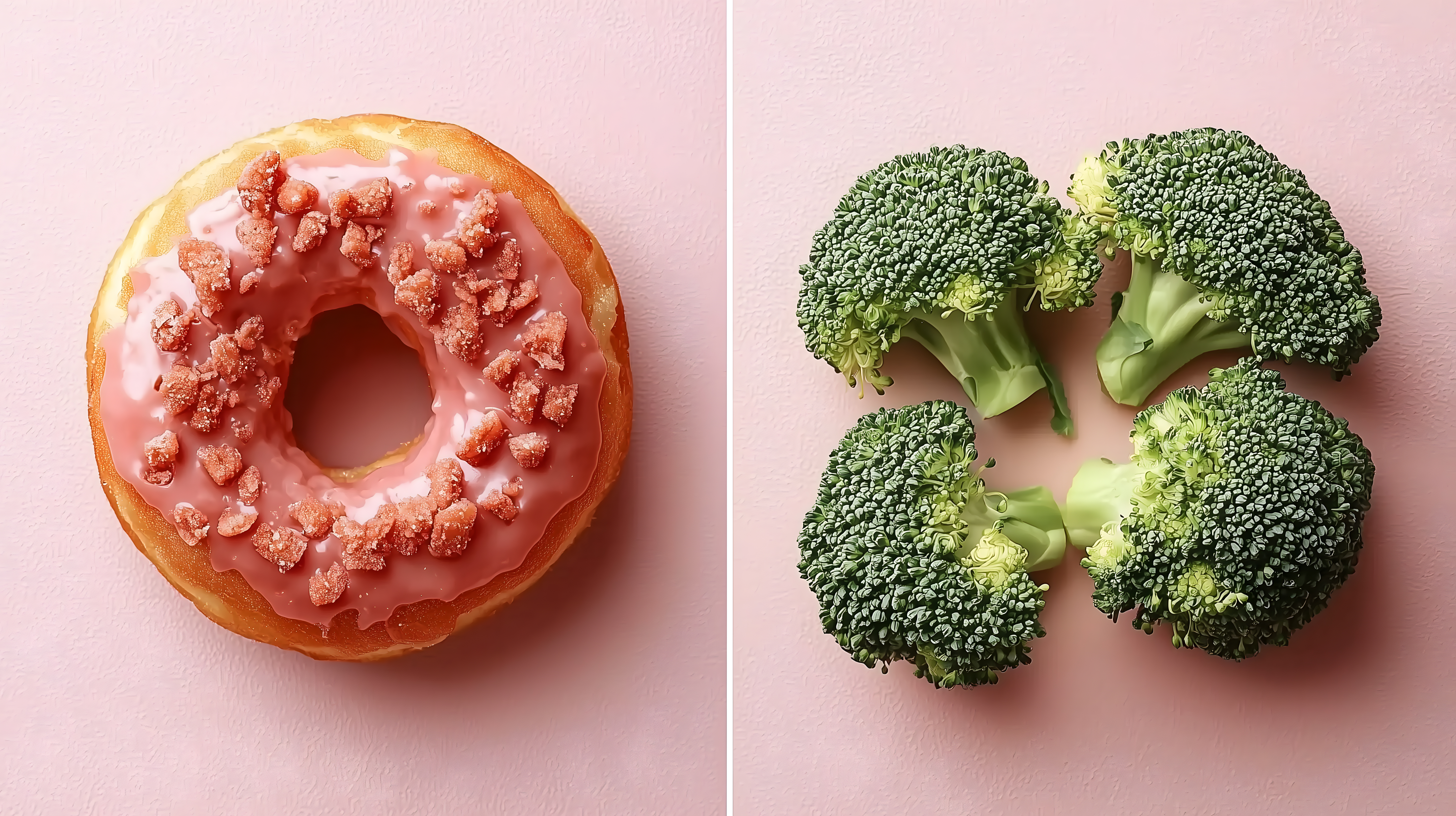 Dieses faszinierende Foto zeigt einen Kontrast zwischen zwei köstlichen Lebensmitteln: einem rosafarbenen, zuckrig-glasierten Donut und frischen, knackigen Brokkoliröschen. Die Süßigkeit und Fülle des Donuts steht in spannender Gegenüberstellung zur Frische und Gesundheit des grünen Gemüses. Die Aufnahme besticht durch ihre lebendigen Farben, die sorgfältige Komposition und das appetitliche Arrangement. Dieses hochauflösende Stockfoto eignet sich hervorragend für Verwendungen in Blogs, Newslettern, sozialen Medien oder Werbematerialien - ob als Eyecatcher, Hingucker oder Illustrationsvorlage. Es steht unter einer Creative Commons-Lizenz zur Verfügung und kann kostenlos genutzt werden.