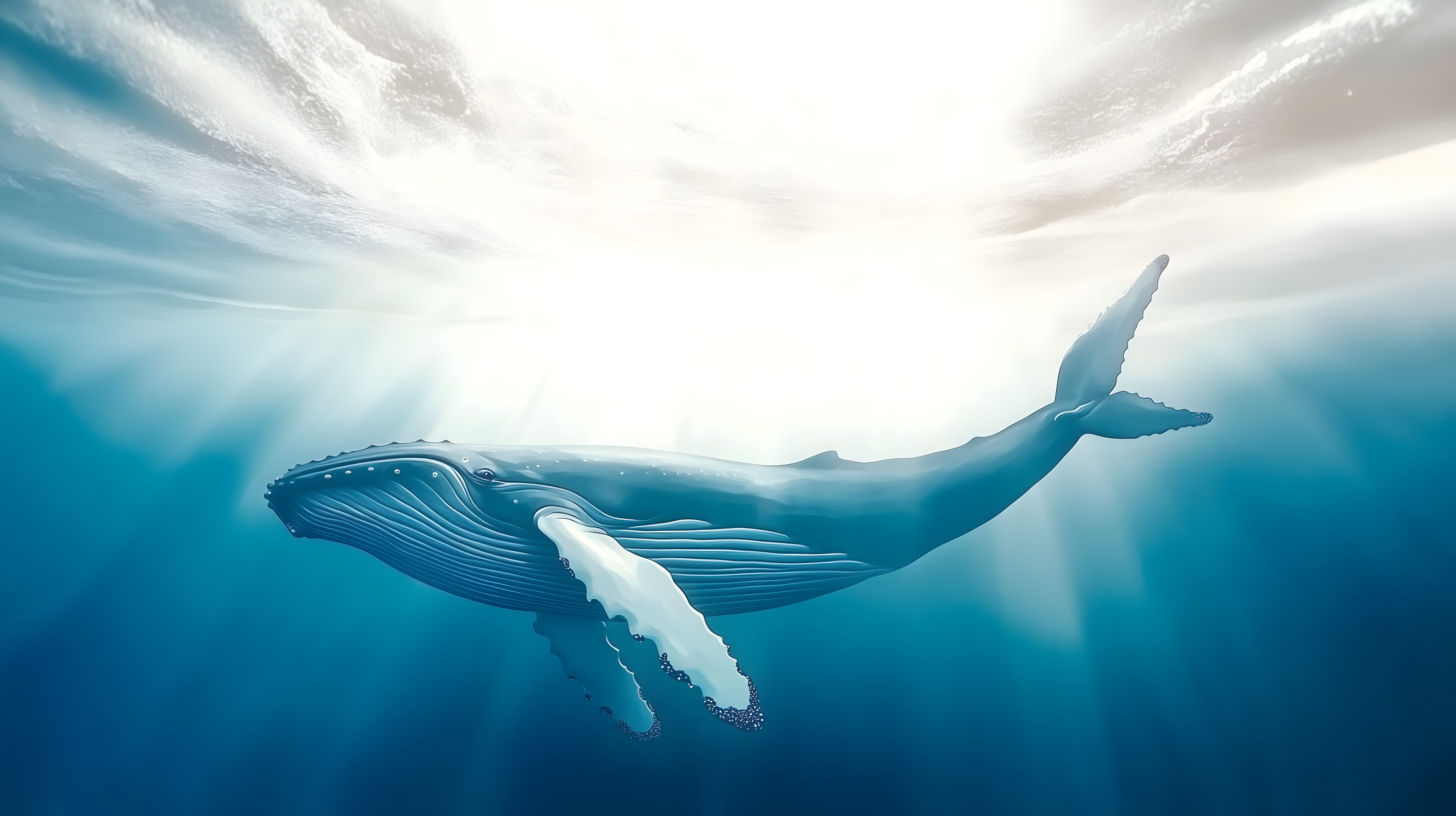 Dieses eindrucksvolle Foto zeigt einen majestätischen Buckelwal, der elegant durch die kristallklaren, blauen Gewässer des Ozeans gleitet. Der Wal scheint in vollkommener Harmonie mit seiner Umgebung zu schweben, seine gigantische Silhouette vor dem warmen Sonnenlicht und den sanft wabernden Wolken. Die Komposition ist meisterhaft, mit dem Wal als Fokuspunkt und den subtilen Farbverläufen, die eine friedvolle, beinahe spirituelle Stimmung erzeugen. Dieses kostenlose Stockfoto in hoher Auflösung unter Creative-Commons-Lizenz eignet sich perfekt als Hintergrundbild für Blogs, Social-Media-Posts, Werbung und vieles mehr, um eine natürliche, beruhigende Atmosphäre zu schaffen.