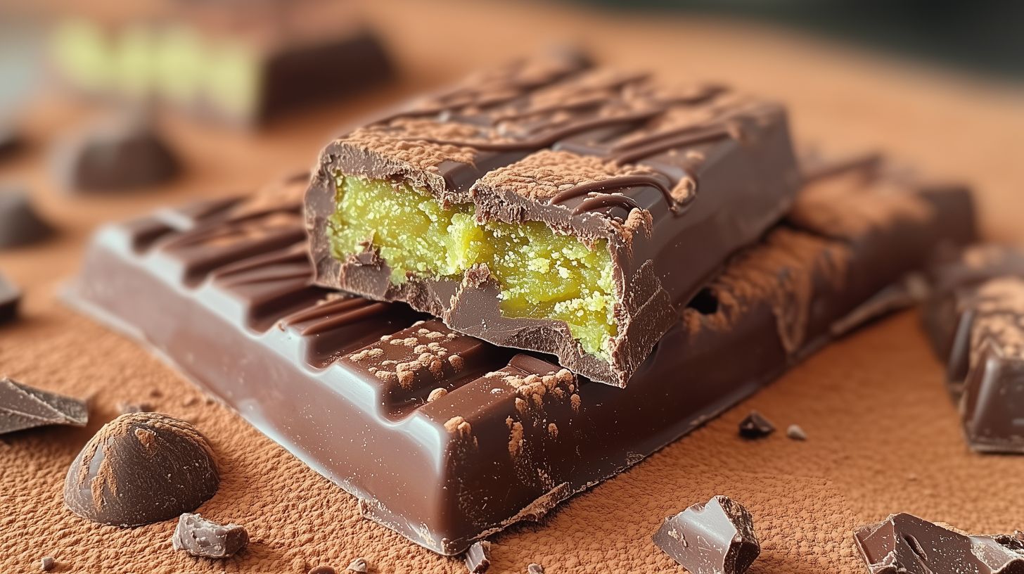 Das Bild zeigt einen Schokoladenriegel, der eine grüne Pistazien-Füllung enthält. Der Riegel ist in Nahaufnahme zu sehen und liegt auf einer holzigen Oberfläche, umgeben von weiteren Schokoladenstücken. Die Oberfläche des Riegels weist eine feine Textur auf, die den Eindruck von Qualität und Handwerkskunst vermittelt. Die Kombination aus dem dunklen Schokoladenüberzug und der hellen, grünen Füllung schafft einen reizvollen Kontrast, der das Bild sehr appetitlich erscheinen lässt. Dieses kostenlose Stockfoto in hoher Auflösung unter Creative-Commons-Lizenz eignet sich hervorragend für die Verwendung in Blogs, Newslettern, Social-Media-Beiträgen oder Werbematerialien im Bereich Lebensmittel, Genuss und Süßigkeiten.