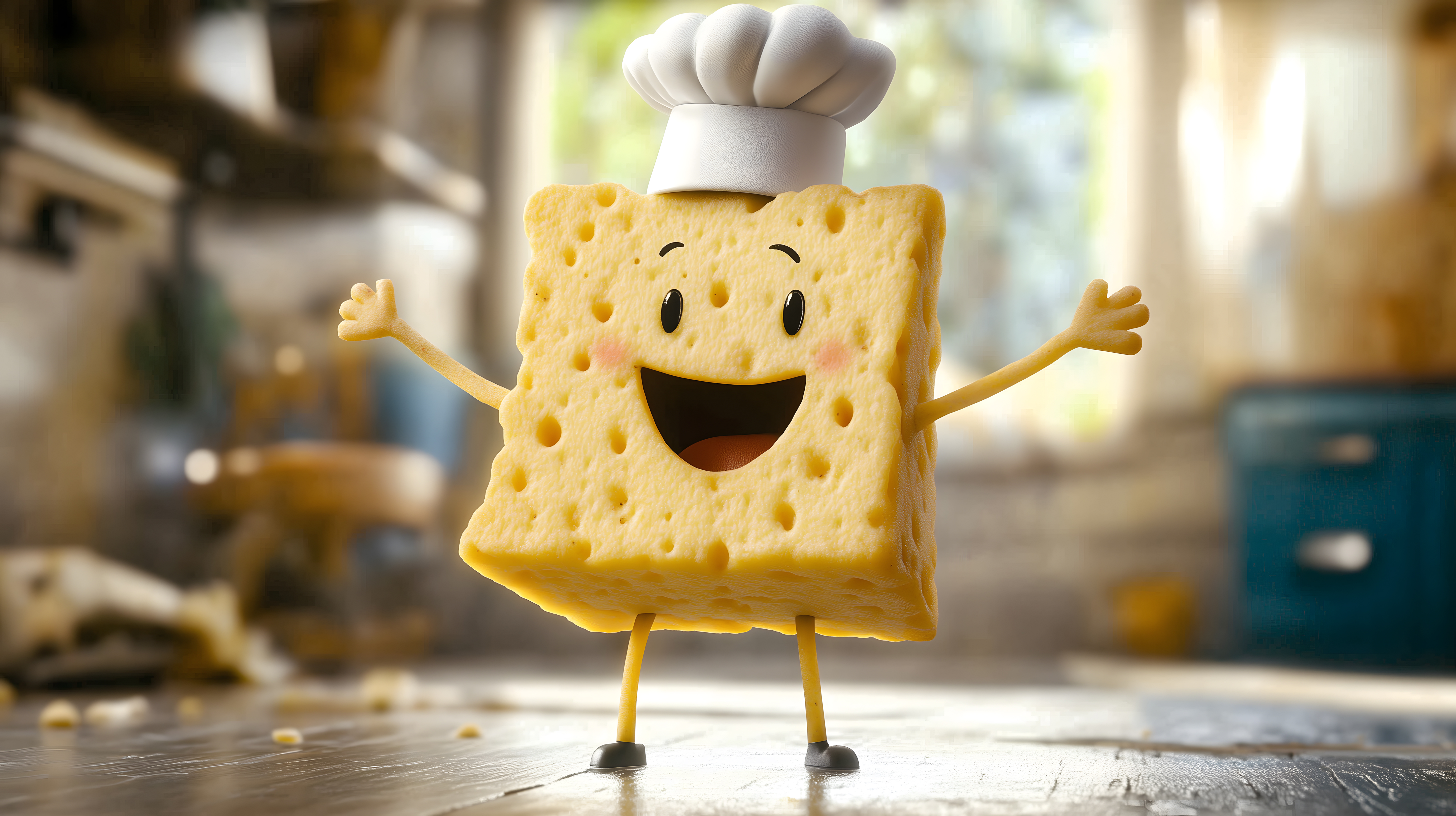 Das Bild zeigt eine fröhliche, cartoon-artige Darstellung eines lachenden Käsewürfels, der eine Kochmütze trägt. Mit ausgebreiteten Armen und breitem Lächeln steht der Käsewürfel in einer detailreichen Küchen-Umgebung. Durch seine auffallend niedliche und humorvolle Gestaltung eignet sich dieses Foto ideal als Hingucker für Rezept-Blogs, kulinarische Newsletter oder Social-Media-Kanäle rund um das Thema Kochen und Gastronomie. Als hochauflösendes Stockfoto unter Creative-Commons-Lizenz kann es kostenlos für verschiedene Einsatzzwecke verwendet werden.
