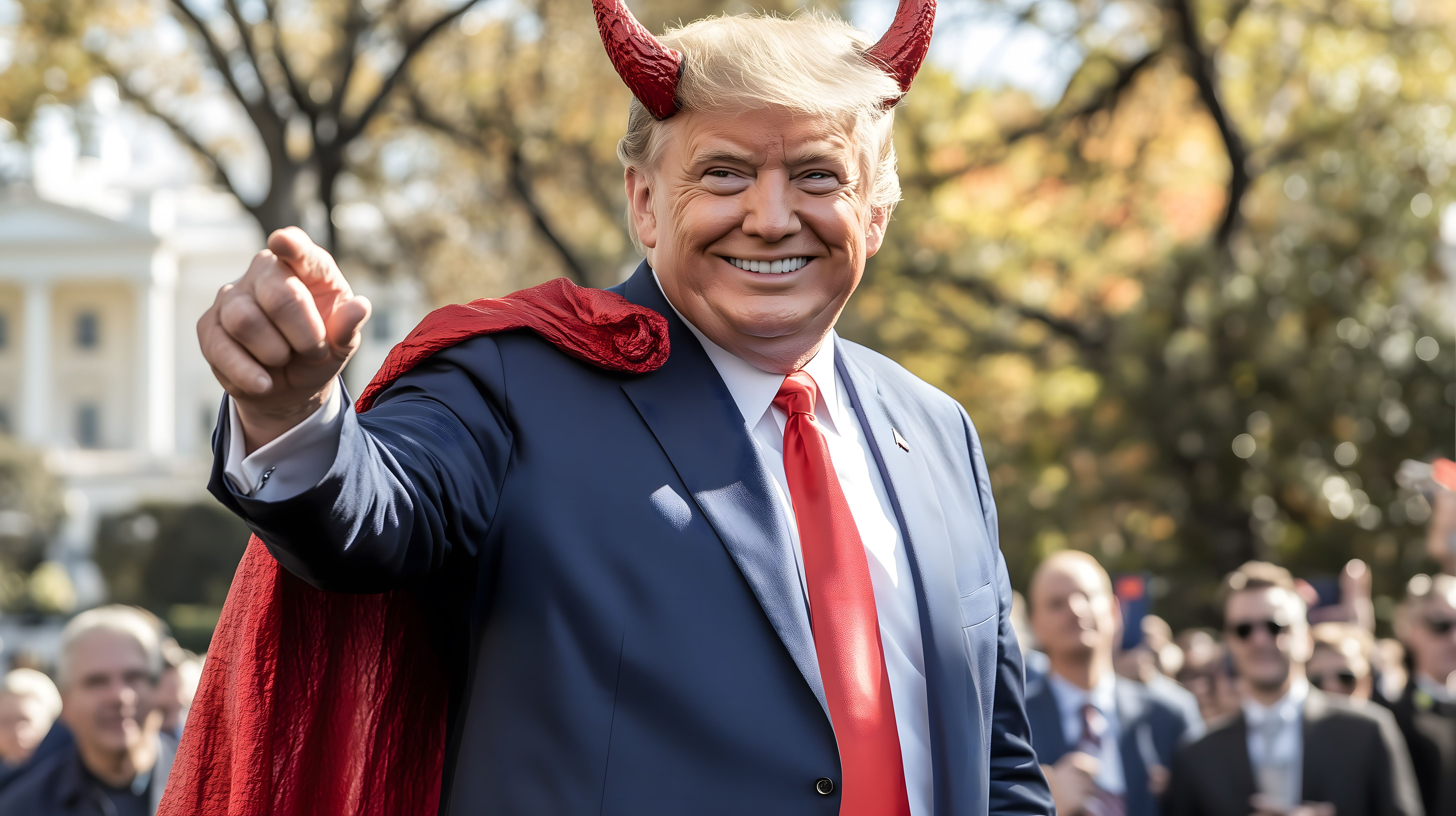 Das Foto zeigt einen Mann in einem Anzug und Krawatte, der eine rote Teufelskostümjacke mit Hörnern trägt und fröhlich lächelt. Die Szene spielt sich im Freien vor Bäumen ab, was einen Herbststimmung vermittelt. Das Bild hat einen satirischen, karikaturartigen Charakter und könnte für politische Illustrationen, Satire oder Karikaturen verwendet werden. Als hochwertiges, kostenloses Stockfoto in hoher Auflösung steht es unter einer Creative-Commons-Lizenz zur Verfügung.
