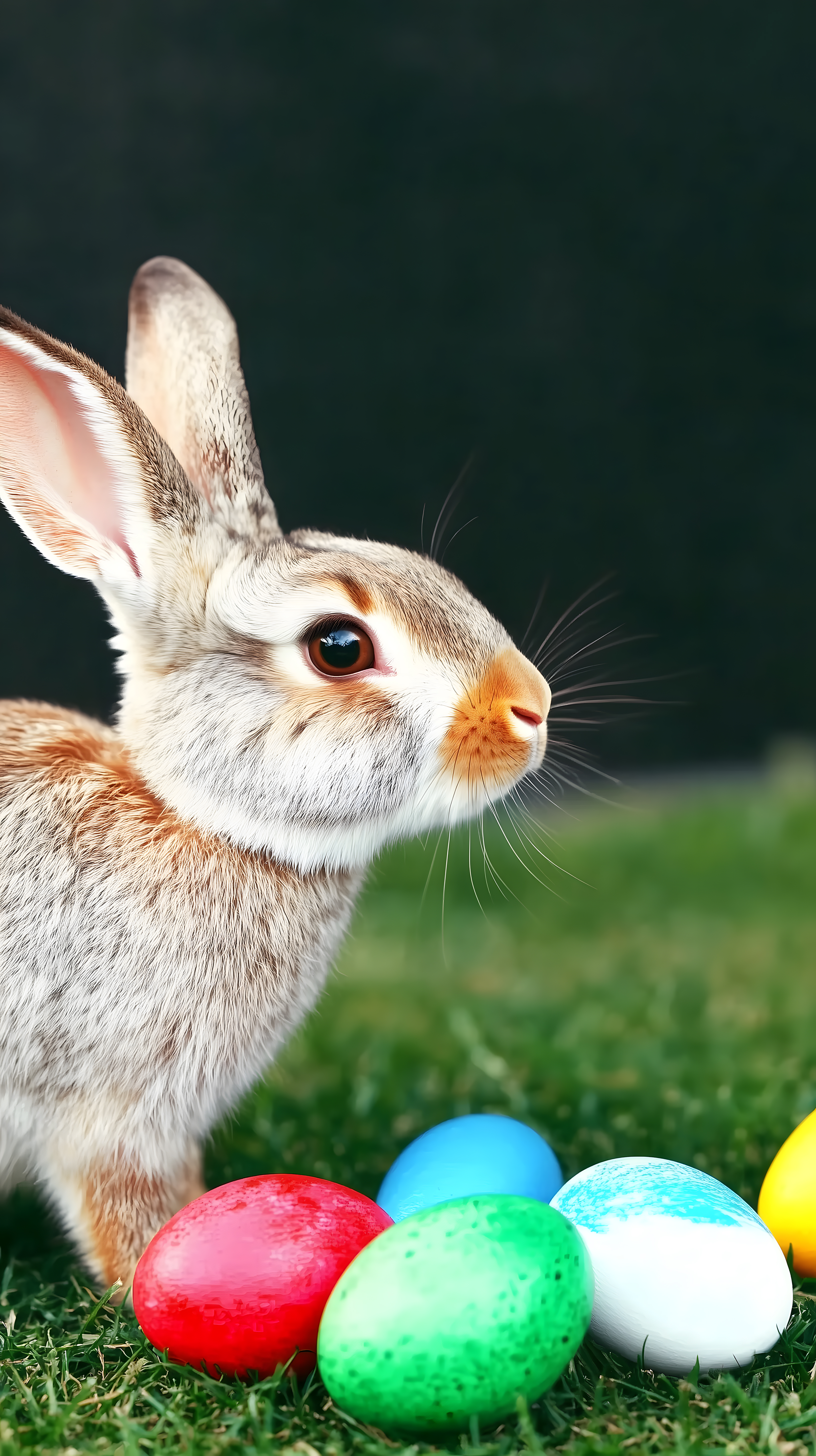 Das Foto zeigt einen Osterhasen, der inmitten bunter Ostereier auf einer grünen Wiese sitzt. Der Hase hat ein sanftes, aufmerksames Gesichtsausdruck und seine Ohren sind sichtbar. Die Eier in den Farben Rot, Grün, Blau und Gelb liegen verstreut um den Hasen herum, was ein klassisches Ostermotiv ergibt. Das Bild ist mit hoher Auflösung aufgenommen und könnte perfekt für Osterdekorationen, Blogs, Newsletter oder Werbung rund um das Osterfest verwendet werden. Als kostenloses Stockfoto unter einer Creative-Commons-Lizenz kann es frei genutzt werden.