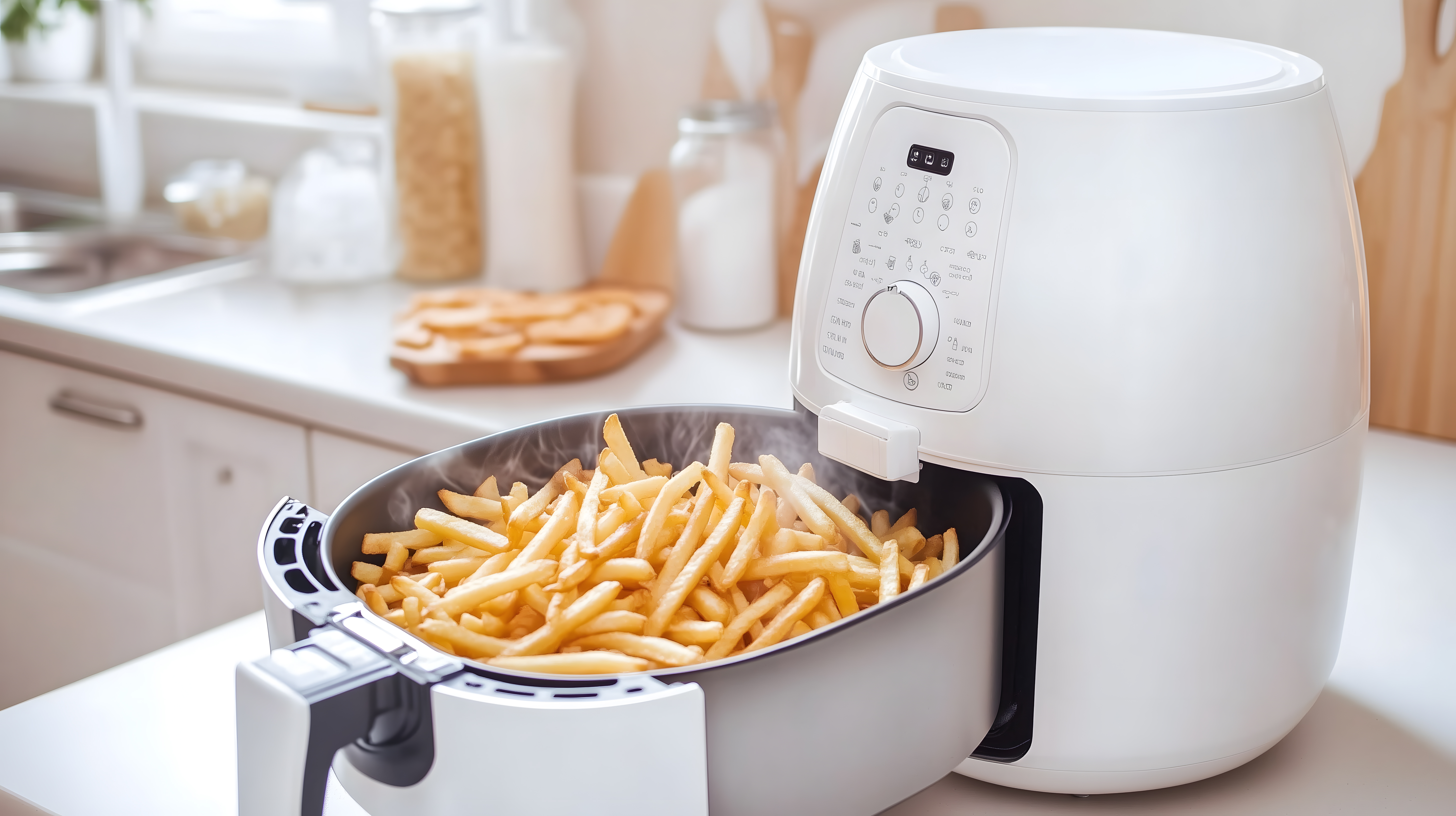Das Bild zeigt eine moderne, weiße Heißluftfritteuse auf einer hellen Küchenzeile. Darin befinden sich goldbraune, knusprige Pommes frites. Im Hintergrund sind weitere Küchenutensilien wie Gläser und Gewürze zu sehen. Die Komposition ist aufgeräumt und lädt zum Nachkochen ein. Dieses kostenllose Stockfoto in hoher Auflösung unter einer Creative-Commons-Lizenz ist ideal für die Verwendung in Blogs, Newslettern, Social-Media-Posts oder Werbeanzeigen rund um das Thema gesunde Ernährung, Küchengeräte oder leckere Snacks.