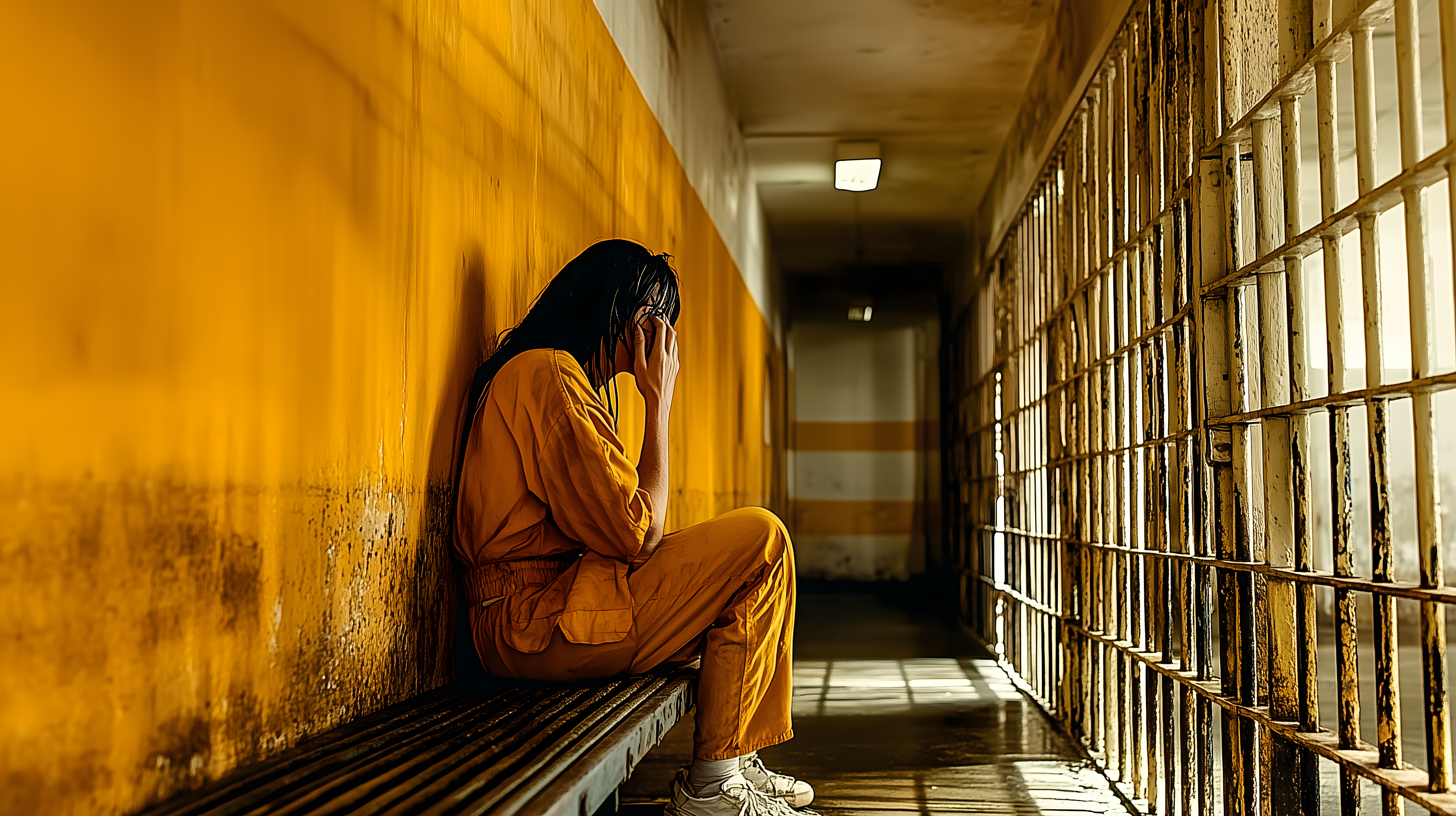 Das Bild zeigt eine einsame und niedergeschlagene Frau, die alleine in einem düsteren Gefängnisflur sitzt. Sie sitzt auf einer hölzernen Bank, umgeben von kahlen, orangefarbenen Wänden und Gitterfenstern, die den Raum in ein melancholisches Licht tauchen. Der Blick der Frau ist nach unten gerichtet, ihre Körperhaltung wirkt resigniert und niedergeschlagen, als würde sie eine schwere Last tragen.
