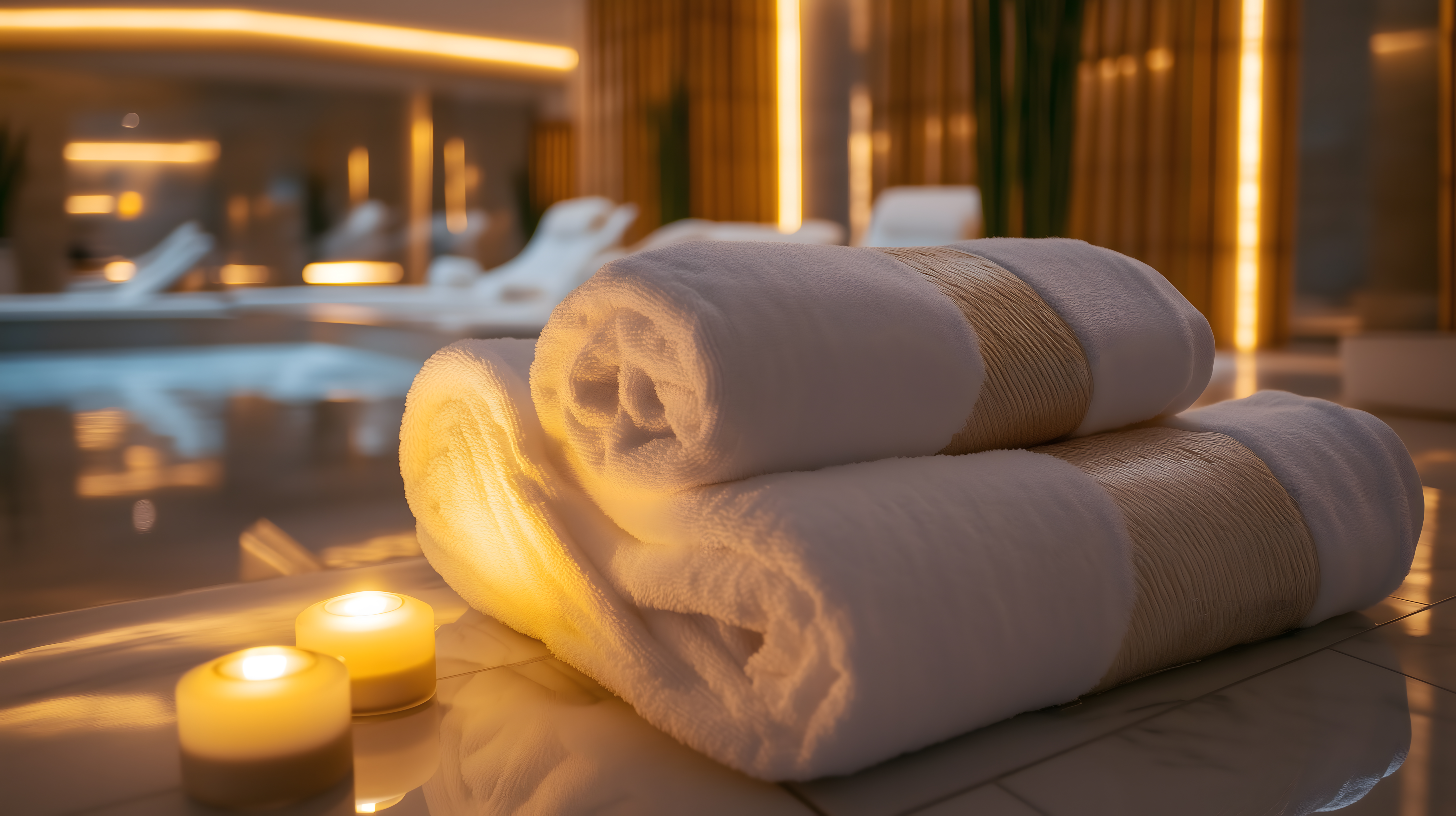 Dieses Foto zeigt eine einladende Wellness-Atmosphäre mit weichen Handtüchern und brennenden Kerzen. Die Textilien sind in warmen, dezenten Farbtönen gehalten und sorgen für einen gemütlichen, luxuriösen Eindruck. Die Komposition lenkt den Blick auf die Handtücher, die in sanftem Licht liegen, und vermittelt ein Gefühl von Ruhe und Entspannung. Dieses hochauflösende Stockfoto eignet sich perfekt für Wellness-Themen in Blogs, Newslettern, Social-Media-Posts oder Werbematerialien und ist unter einer Creative-Commons-Lizenz kostenfrei für viele Einsatzzwecke verfügbar.