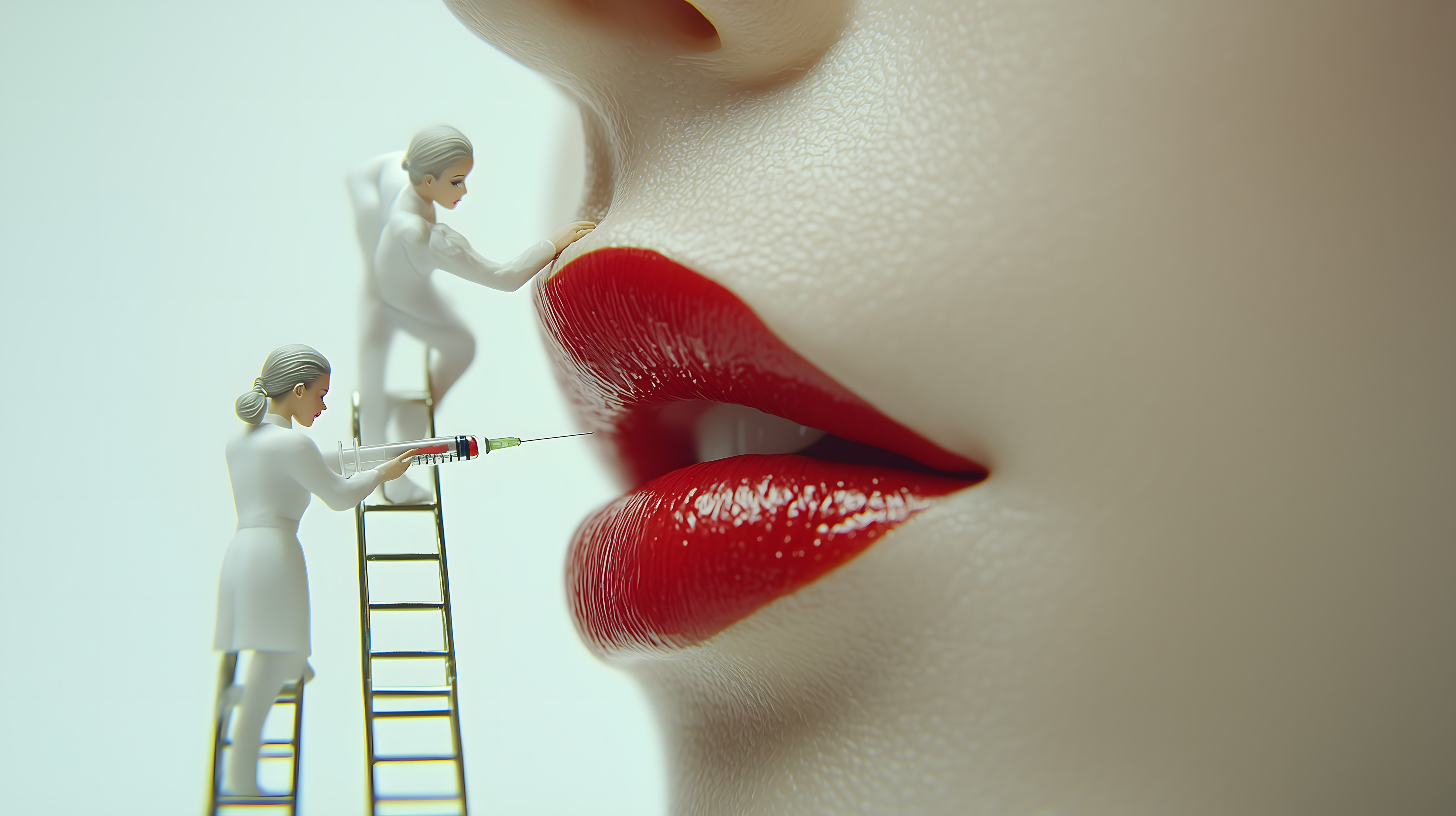 Das Bild zeigt eine surreale Szene, in der Miniaturmodelle einer medizinischen Behandlung an riesigen Lippen vornehmen. Die Lippen sind leuchtend rot und stehen im Kontrast zu dem hellen, sterilen Hintergrund. Die Miniaturfiguren stehen auf Leitern und injizieren die Lippen, was als Symbol für die Schönheitschirurgie und Körpermodifikation interpretiert werden kann. Das Bild hat eine konzeptuelle, künstlerische Ästhetik und könnte für Werbung, Blogbeiträge oder Social-Media-Inhalte rund um das Thema Schönheit und Körperpflege eingesetzt werden. Es handelt sich um ein kostenloses Stockfoto in hoher Auflösung, das unter einer Creative-Commons-Lizenz veröffentlicht wurde.