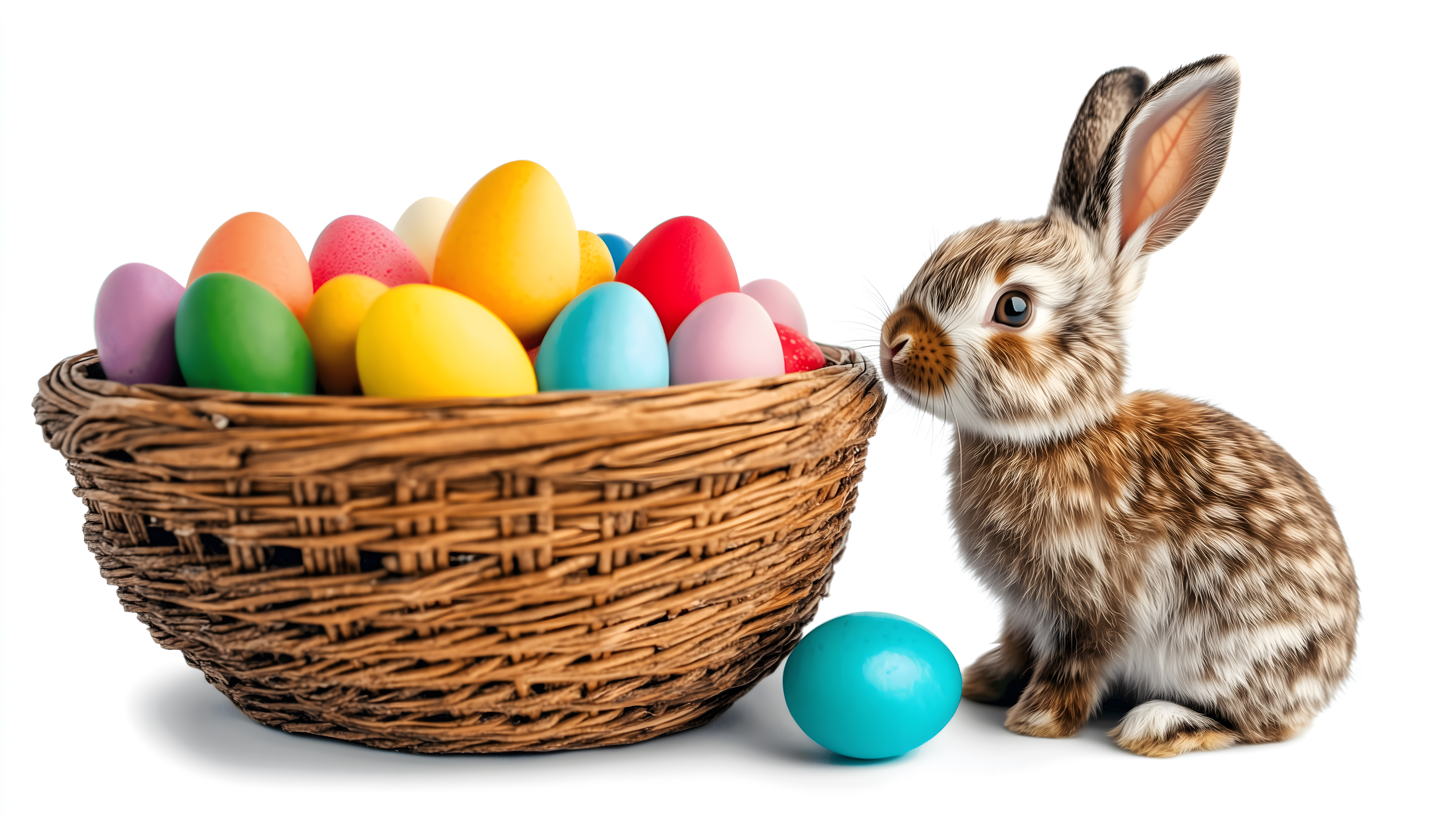 Das Bild zeigt einen süßen Osterhasen, der neben einem Korb mit bunten, farbenfrohen Ostereiern sitzt. Der Hase hat einen braunen, gefleckten Fellmantel und große, aufmerksame Augen. Der Weidenkorb ist mit verschiedenfarbigen Eiern in Pastelltönen gefüllt - von kräftigem Rot über sanftes Blau bis hin zu hellem Gelb. Die Komposition ist stimmungsvoll und lädt zum Entdecken ein.