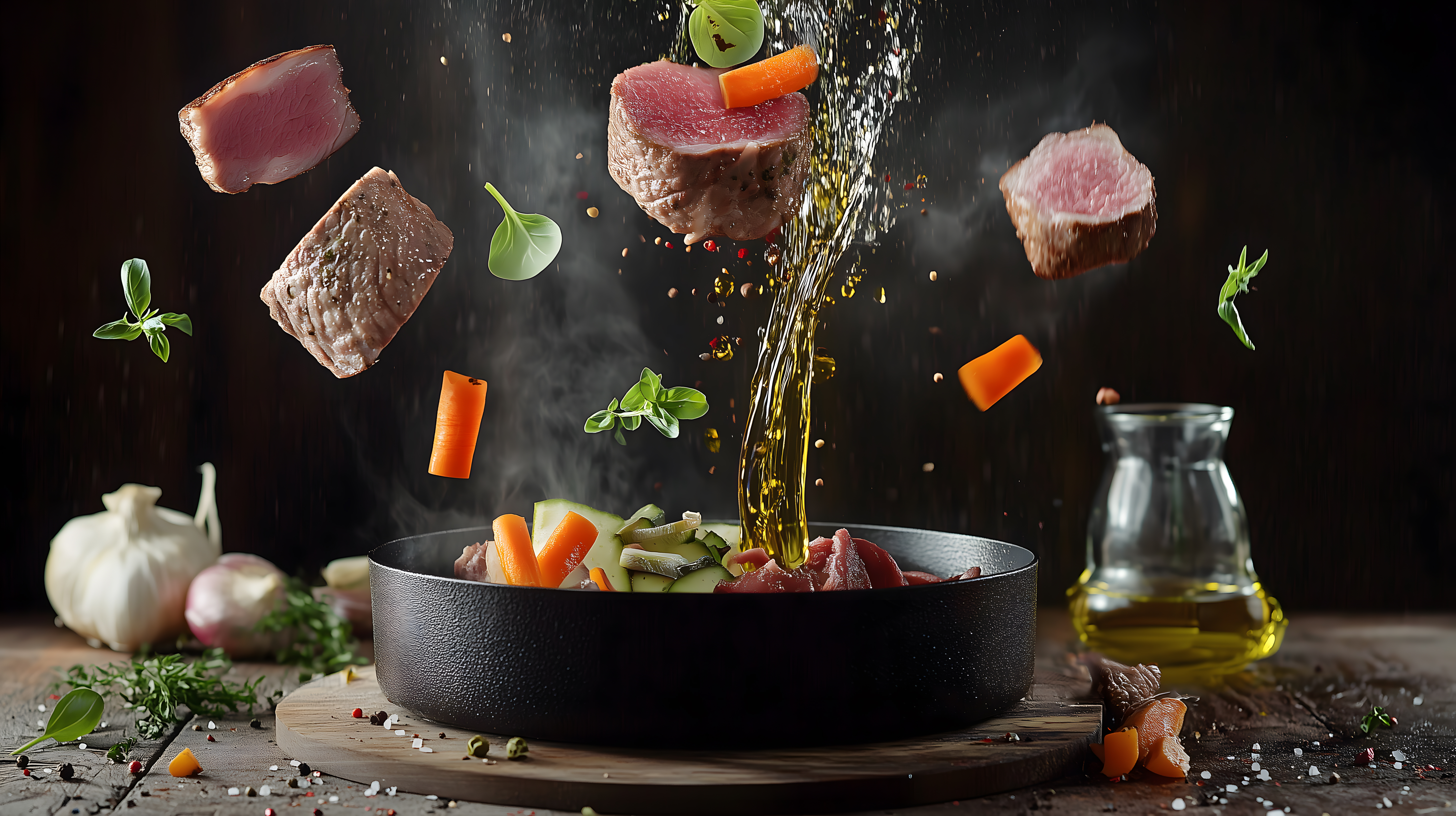 Dieses lebendige Foto zeigt eine dampfende Pfanne, in der Fleisch- und Gemüsestücke in der Luft schweben. Die Bewegung der Zutaten und der heraussprudelnde Dampf verleihen dem Bild eine dynamische, fast magische Anmutung. Das Foto eignet sich hervorragend für Rezeptbeiträge, Foodblogs oder Werbungen rund um das Thema Kochen und gesunde Ernährung. Als hochwertiges Stockfoto in hoher Auflösung und mit Creative-Commons-Lizenz ist es universell einsetzbar.