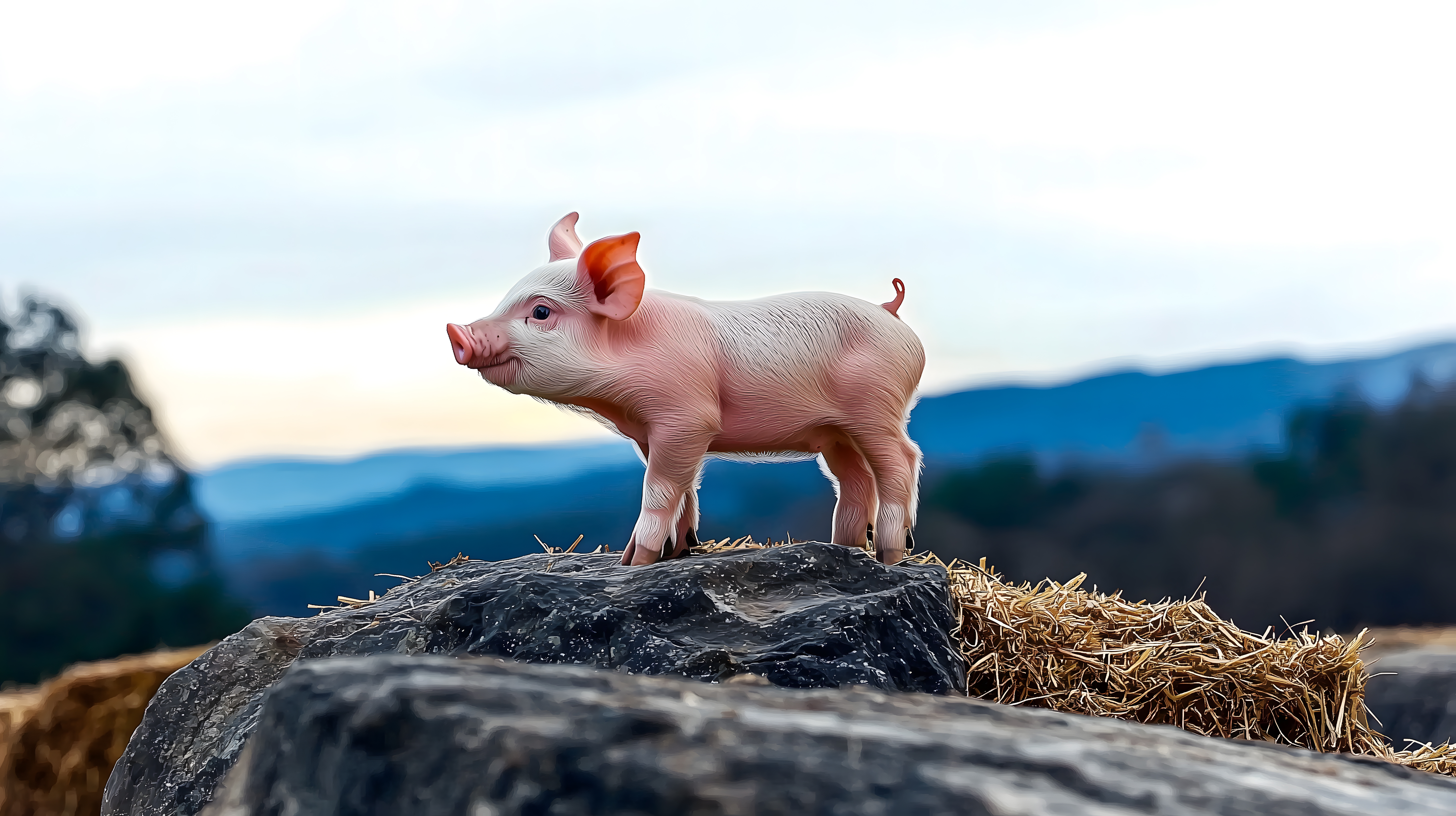 Das Bild zeigt ein niedliches Ferkel, das stolz auf einem Heuballen in einer bergigen Landschaft steht. Der Blick des Tieres ist selbstbewusst und verspielt, umgeben von einer idyllischen Umgebung aus Wiesen, Bäumen und der majestätischen Bergkulisse im Hintergrund. Dieses Stockfoto in hoher Auflösung eignet sich hervorragend für die Verwendung in Blogs, Newslettern, Social-Media-Beiträgen oder Werbematerialien mit ländlichem, frischem oder bäuerlichem Motiv. Es steht unter einer Creative-Commons-Lizenz kostenlos zur Verfügung.
