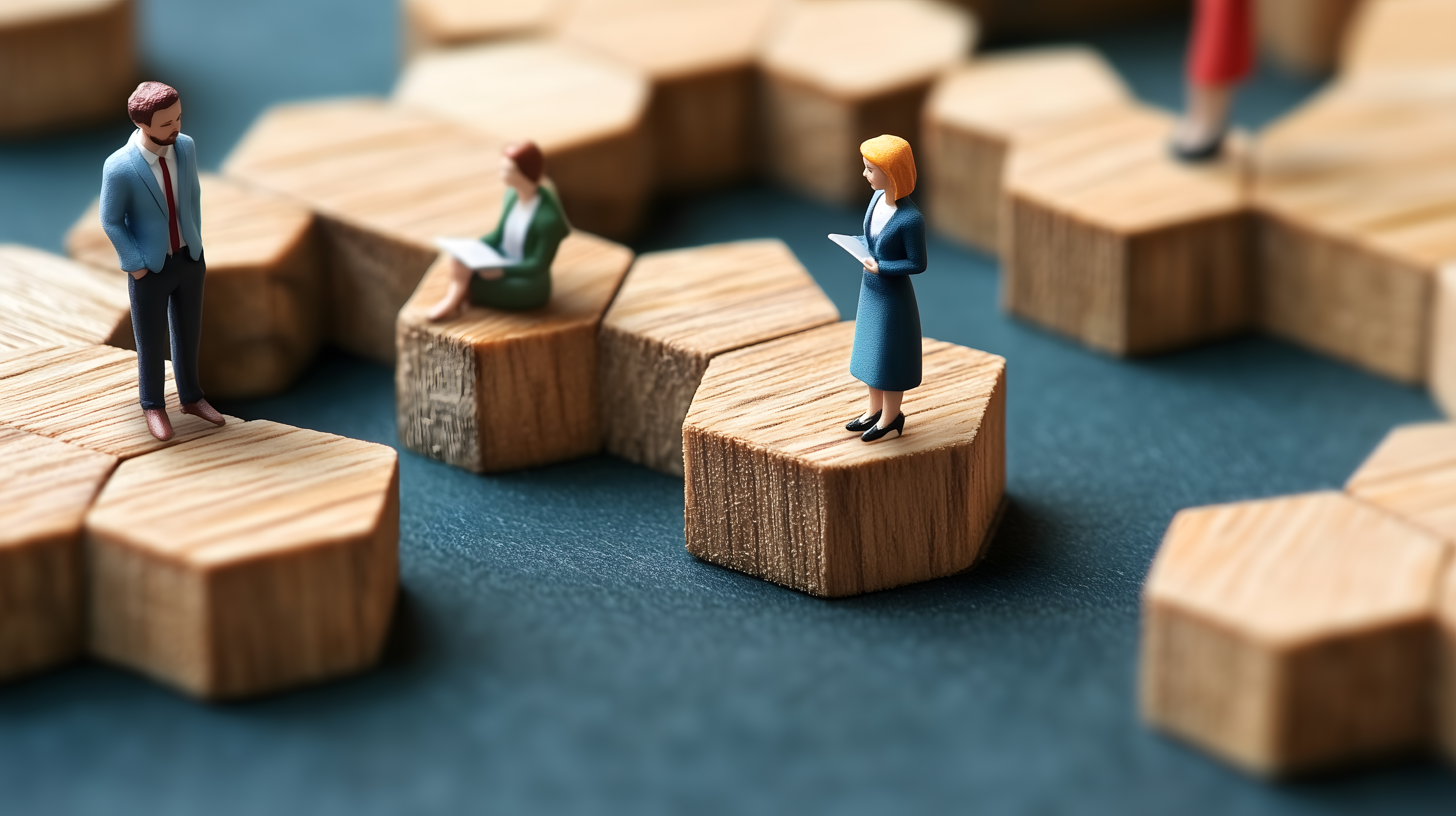 Dieses Bild zeigt eine abstrakte Darstellung von Geschäftshierarchie auf Holzplattformen. Zu sehen sind mehrere kleine Figurenmodelle, die verschiedene Positionen in einem Unternehmen symbolisieren. Die Figuren stehen auf unterschiedlich hohen, hexagonalen Holzstücken, die eine Art Stufenordnung suggerieren. Das Bild vermittelt Konzepte wie Führung, Teamarbeit, Aufstieg und Unternehmensentwicklung auf eine minimalistische, symbolische Art und Weise.