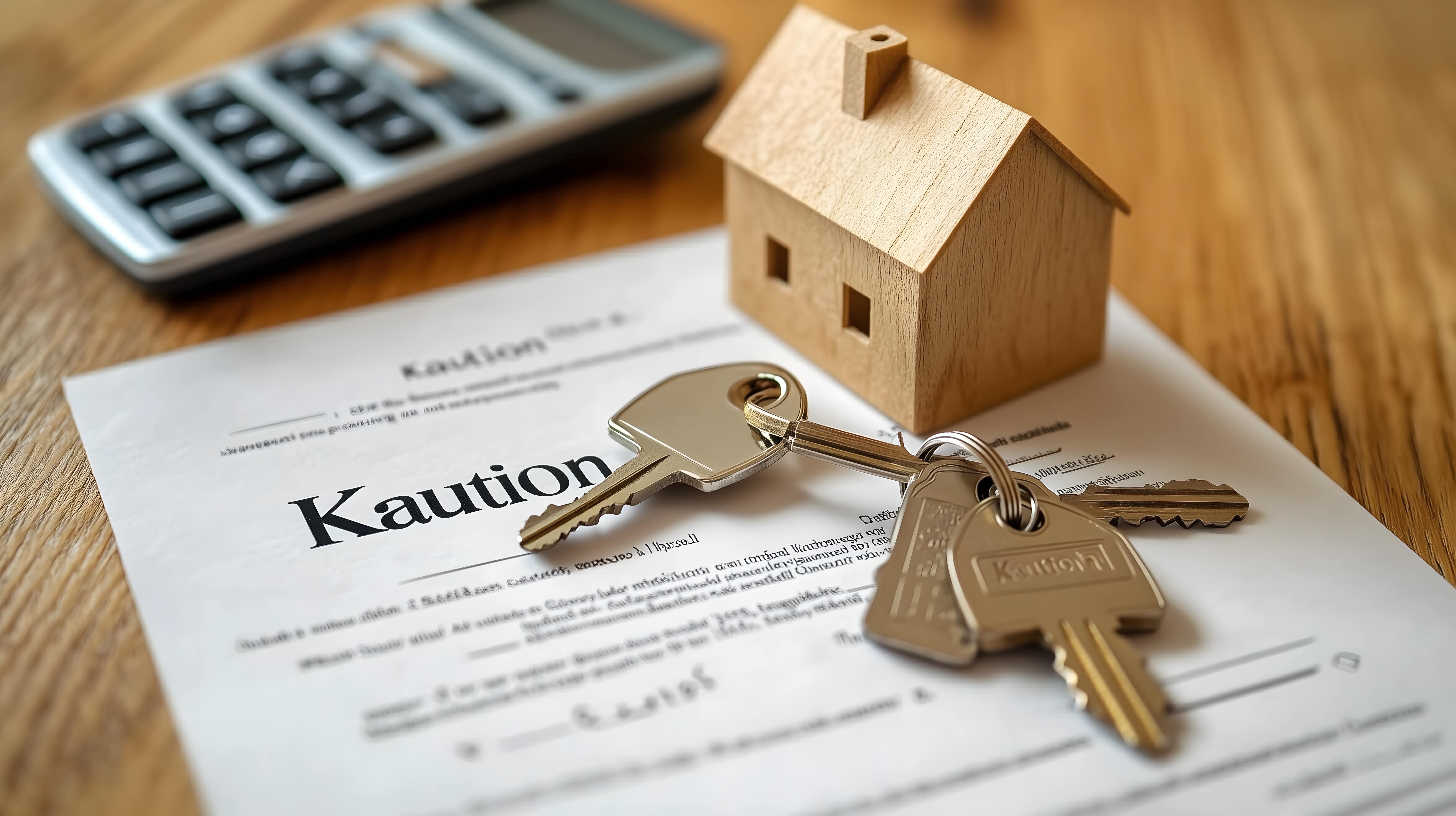 Das Bild zeigt eine Assoziation rund um das Thema Mietkaution und Mietvertrag. Im Vordergrund liegen die Schlüssel für eine neue Unterkunft zusammen mit einem Mietvertrag auf einem Holztisch. Neben dem Vertrag steht ein kleines Holzhaus als Symbol für die neue Wohnung. Daneben befindet sich ein Taschenrechner, der auf die finanzielle Berechnung und Abwicklung des Mietvertrags hindeutet.