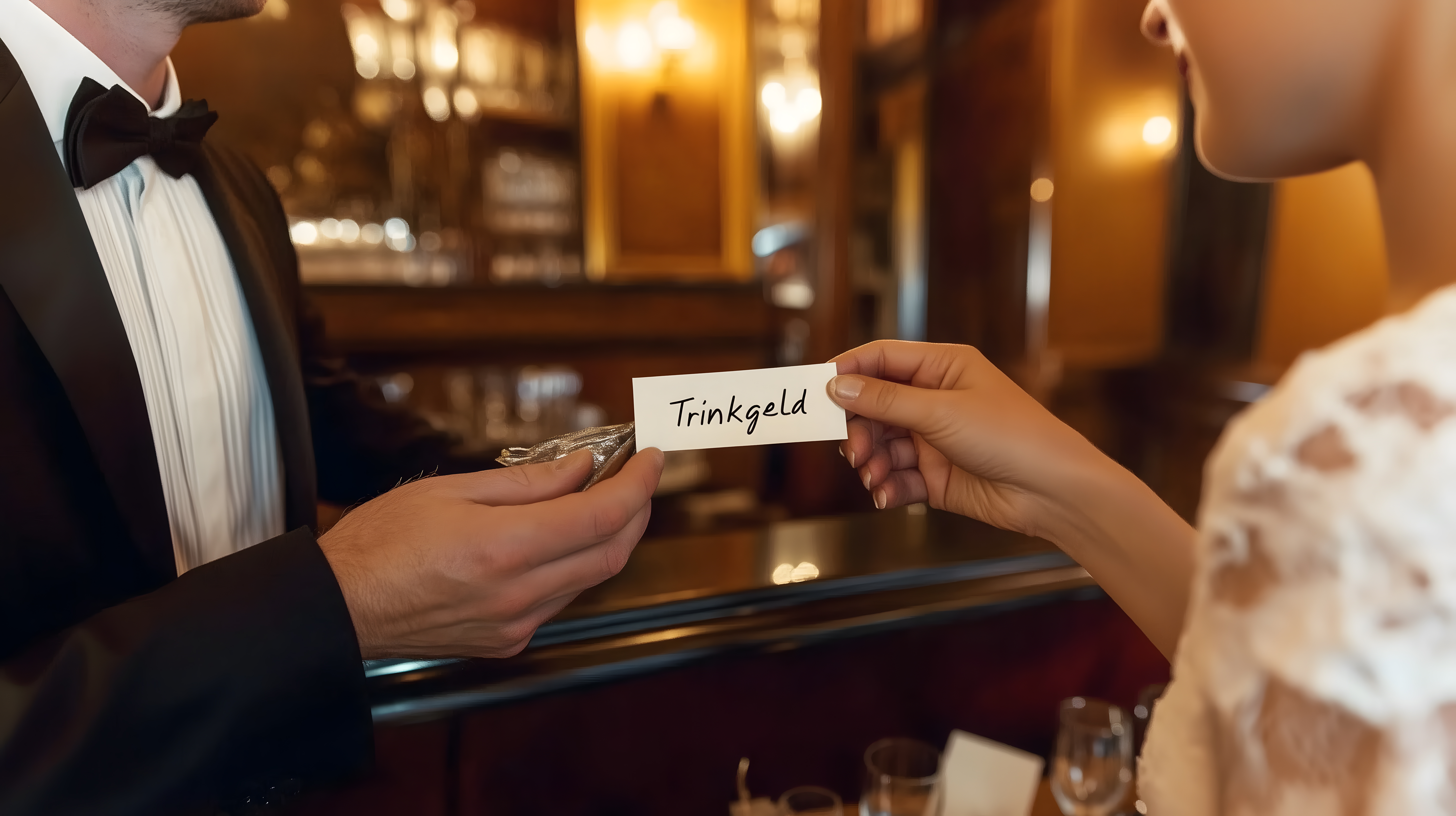 Das Bild zeigt eine Trinkgeldübergabe in einem eleganten, hochwertig eingerichteten Restaurant. Der Kellner in seinem formellen Anzug reicht einer Frau einen Zettel mit der Aufschrift 'Trinkgeld'. Die Szene vermittelt einen stilvollen, gehobenen Rahmen - von den dunklen, holzigen Einrichtungsdetails bis zur warmen, stimmungsvollen Beleuchtung. Das Foto eignet sich hervorragend für die Verwendung in Gastronomiebereichen, in Artikeln zu Themen wie Etikette oder Geschäftskultur sowie in Design- und Marketingkontexten. Als hochwertiges, kostenloses Stockfoto unter Creative-Commons-Lizenz ist es vielseitig einsetzbar.