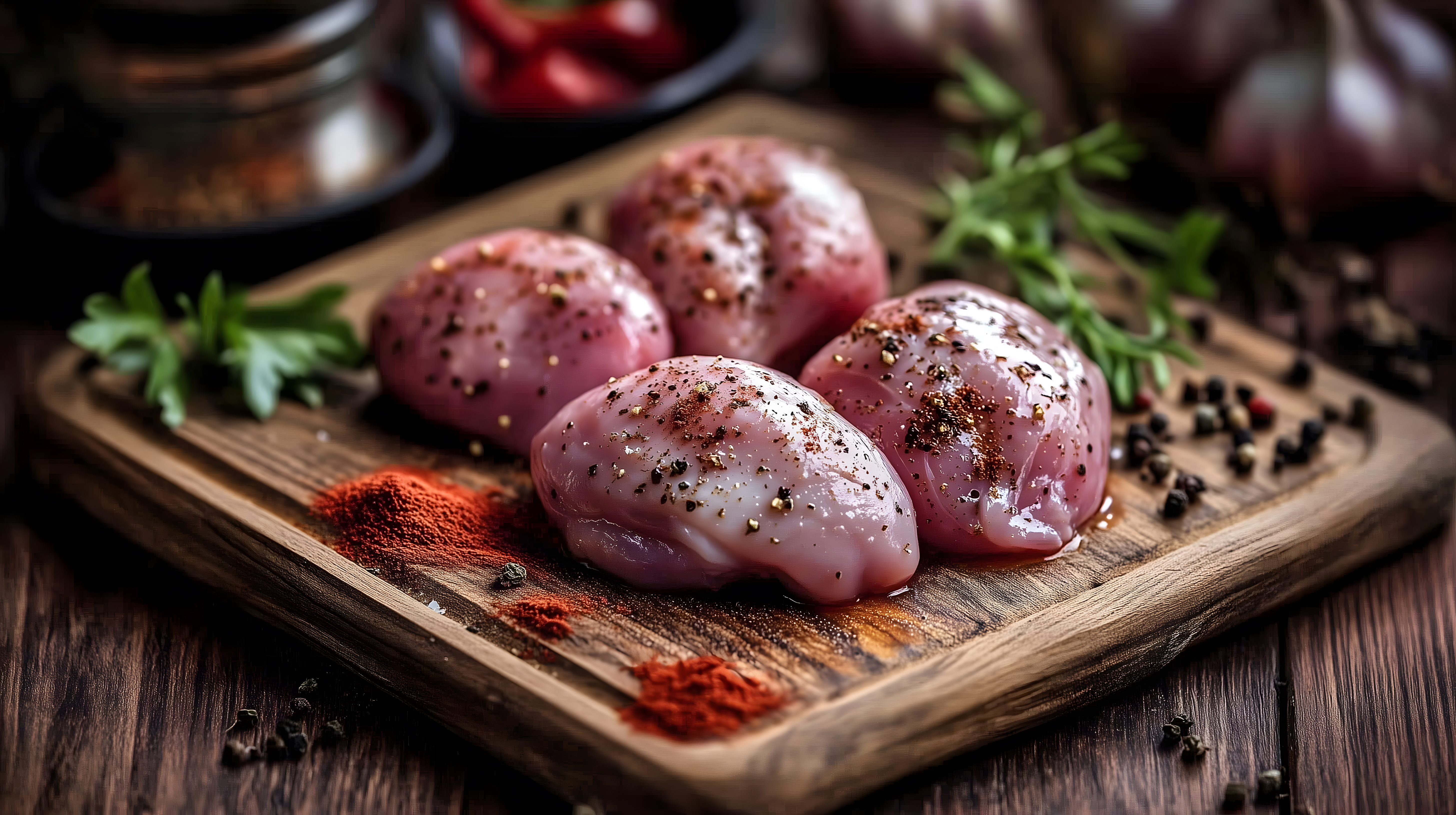 Dieses Foto zeigt eine Nahaufnahme von roher Hähnchenleber, die mit verschiedenen Gewürzen auf einem rustikalen Holzbrett arrangiert ist. Die dunkle, natürliche Optik des Bildes verleiht der Szene eine authentische, handwerkliche Atmosphäre. Die Textur und Farben der Zutaten, ergänzt durch die Kräuter und Gewürze, machen das Foto zu einem stimmungsvollen Eyecatcher für Rezepte, Kochblogs oder Werbematerial rund um das Thema Fleischzubereitung. Als hochwertiges, kostenloses Stockfoto in hoher Auflösung unter der Creative-Commons-Lizenz eignet sich dieses Bild ideal für eine Vielzahl an digitalen und Print-Anwendungen.
