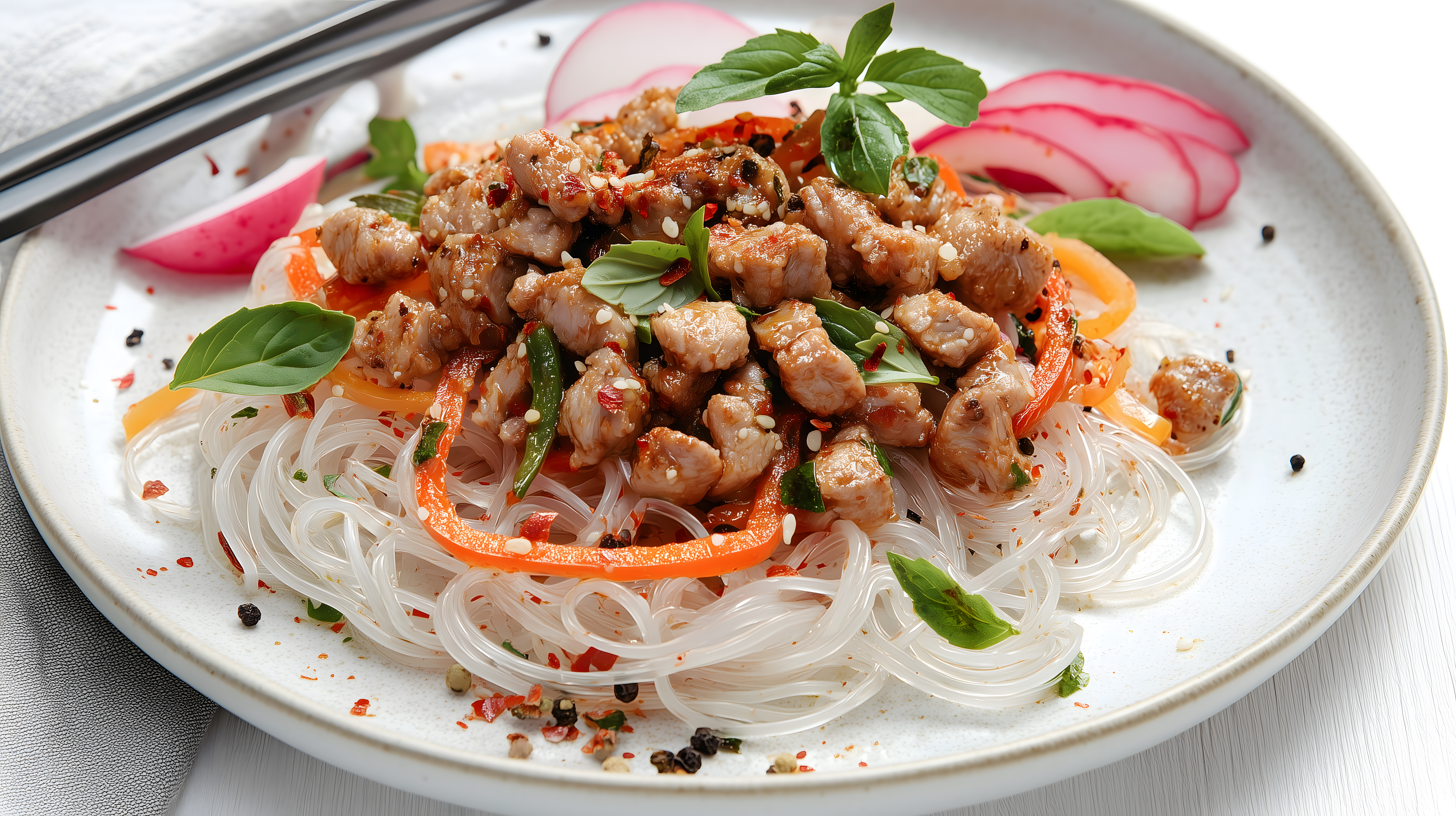 Dieses farbenfrohe Foto zeigt einen appetitlichen Glasnudelsalat mit asiatischem Gemüse und Fleisch. Der Salat ist auf einem hellen Teller angerichtet und garniert mit frischen Kräutern. Die Nudeln sind transparent und liegen neben knackigem, bunt gemischtem Gemüse wie Paprika, Karotte und Frühlingszwiebeln. Dazu kommen würzige, gebratene Fleischstücke. Das Gericht sieht nicht nur sehr lecker, sondern auch sehr gesund aus. Es eignet sich perfekt als Hauptmahlzeit oder als leichter Snack. Dieses hochauflösende, kostenlose Stockfoto kann für verschiedenste Zwecke, wie Blogs, Newsletter oder Werbung, verwendet werden. Die Lizenz erlaubt eine Creative-Commons-Nutzung.