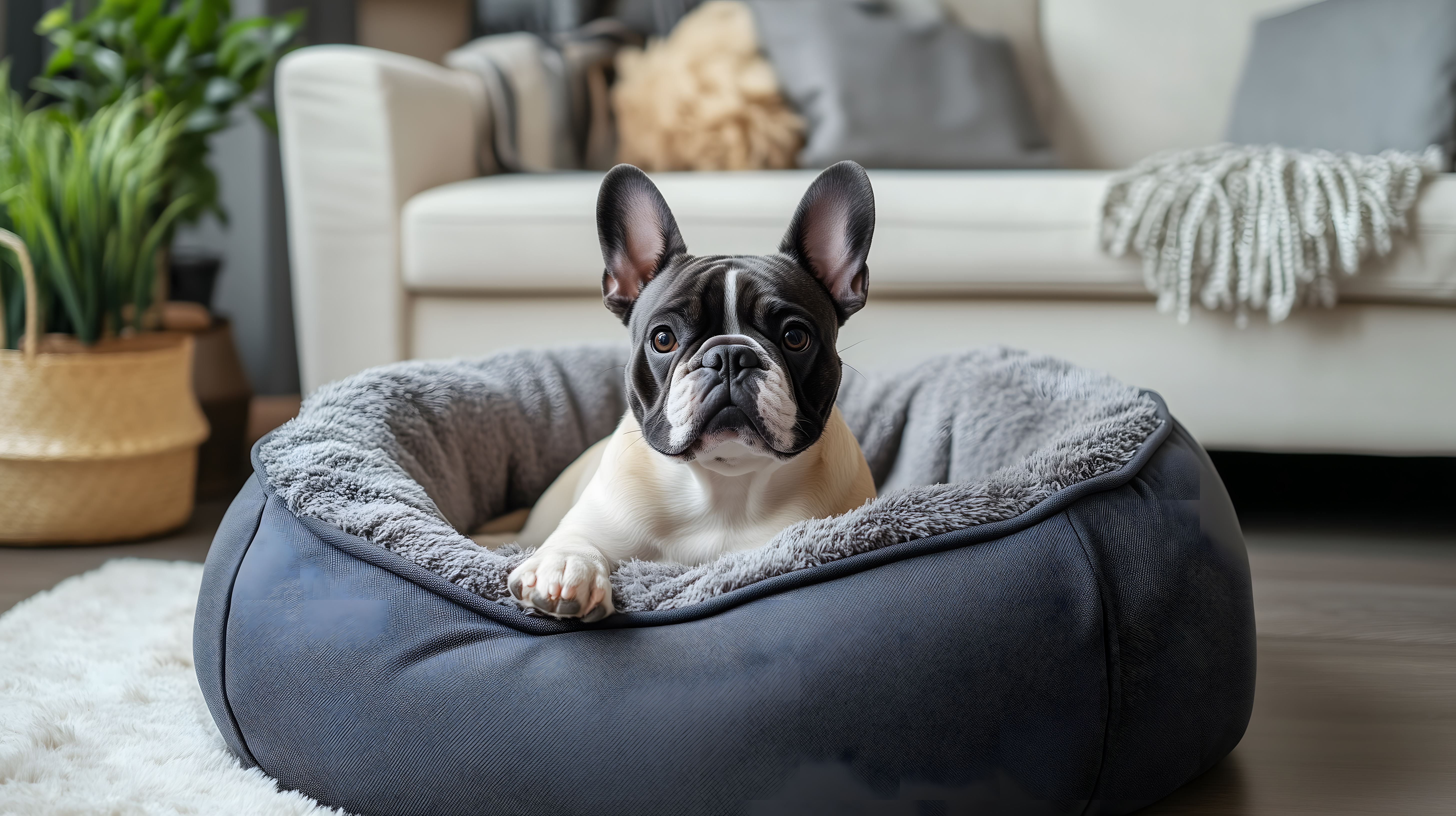 Das Bild zeigt eine niedliche französische Bulldogge, die gemütlich in einem gepolsterten Hundebett ruht. Das Tier liegt inmitten eines modernen Wohnzimmerambientes mit Sofa, Pflanzen und Accessoires in neutralen Farbtönen. Der Hund hat einen ruhigen, entspannten Ausdruck und scheint sich in seinem Heim-Rückzugsort sichtlich wohlzufühlen. Dieses hochwertige Stockfoto in hoher Auflösung eignet sich hervorragend für den Einsatz in Blogs, Newslettern, Social-Media-Beiträgen oder Werbekampagnen rund um das Thema Haustiere und gemütliche Wohnraumgestaltung. Es steht unter einer kostenlosen Creative-Commons-Lizenz zur Verfügung.