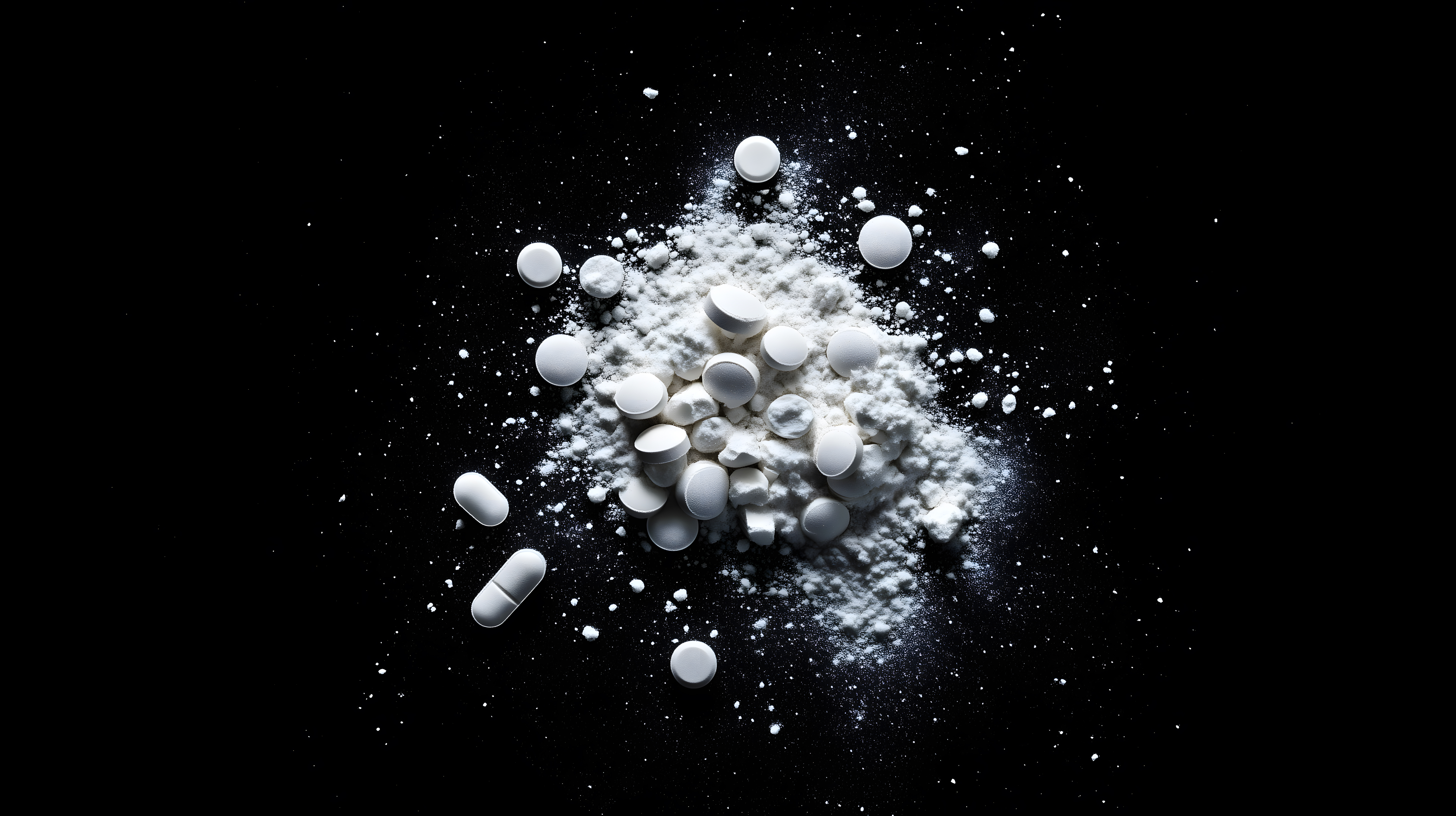 Dieses Foto zeigt eine Ansammlung verschiedener weißer Medikamente und Pulver vor einem dunklen Hintergrund. Die Perspektive ist von oben, sodass die Objekte wie eine abstrakte Komposition aus Formen und Kontrasten wirken. Die weiße Farbe der Pillen und Kristalle hebt sich deutlich vom schwarzen Grund ab und verleiht dem Bild eine starke visuelle Wirkung. Es eignet sich als Stockfoto für den Einsatz in Artikeln, Blogbeiträgen oder Werbematerialien zum Thema Medizin, Pharmazie oder den Umgang mit Drogen. Dieses hochauflösende Foto steht unter einer kostenlosen Creative-Commons-Lizenz zur Verfügung.