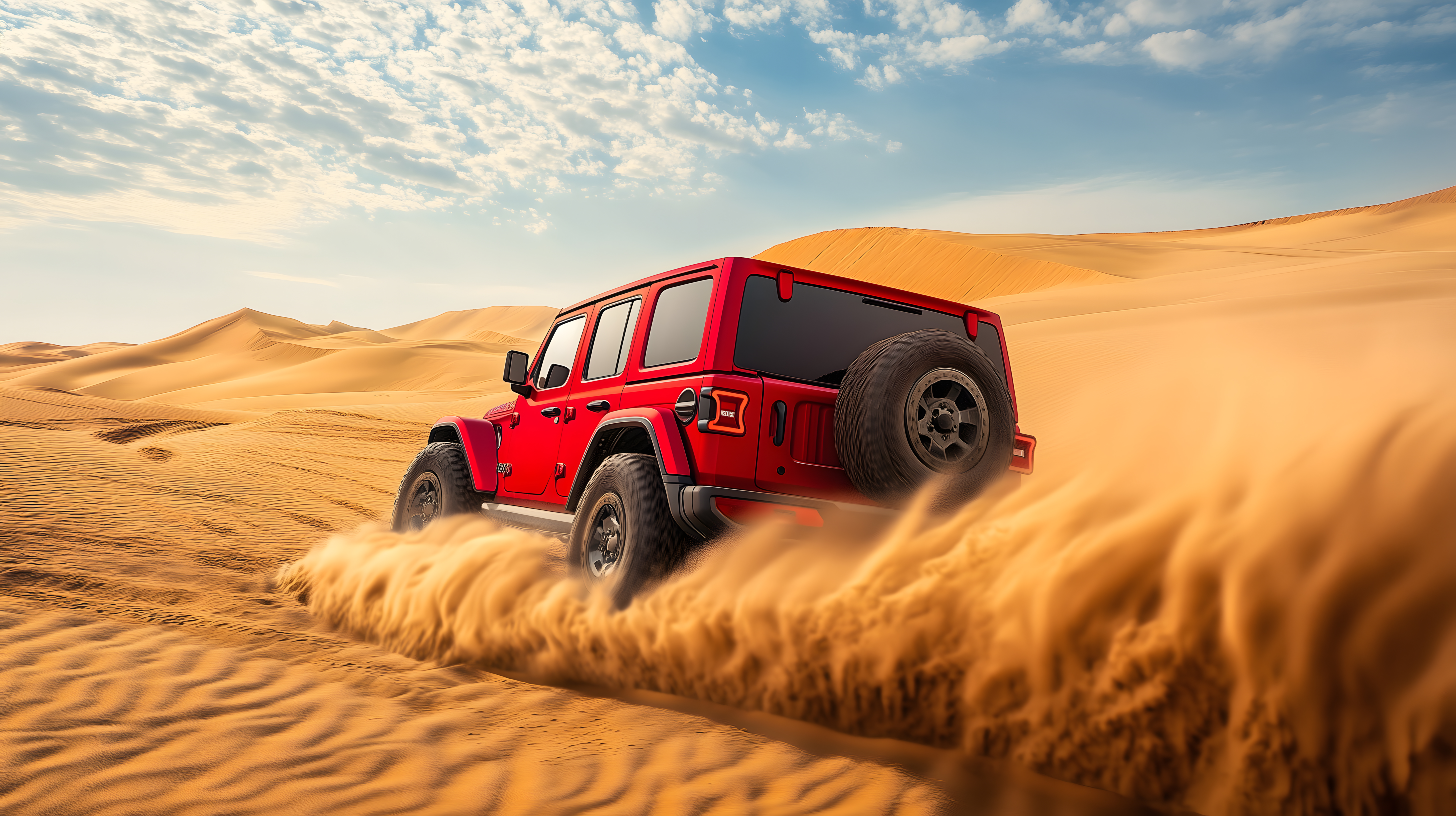 Das Bild zeigt ein rotes Jeep-Fahrzeug, das durch eine weite Wüstenlandschaft fährt und dabei eine Wolke aus Sand und Staub aufwirbelt. Der markante Offroader zieht seine Spur durch die endlose Dünenlandschaft, die von der niedrigen Sonne angenehm beleuchtet wird. Das Foto vermittelt ein Gefühl von Freiheit, Abenteuer und Unabhängigkeit und bietet sich hervorragend für den Einsatz in Blogs, Newslettern oder Werbekampagnen zum Thema Offroad-Fahren, Reisen und Outdoor-Aktivitäten an. Dieses hochauflösende Stockfoto steht unter einer Creative-Commons-Lizenz kostenlos zur Verfügung.