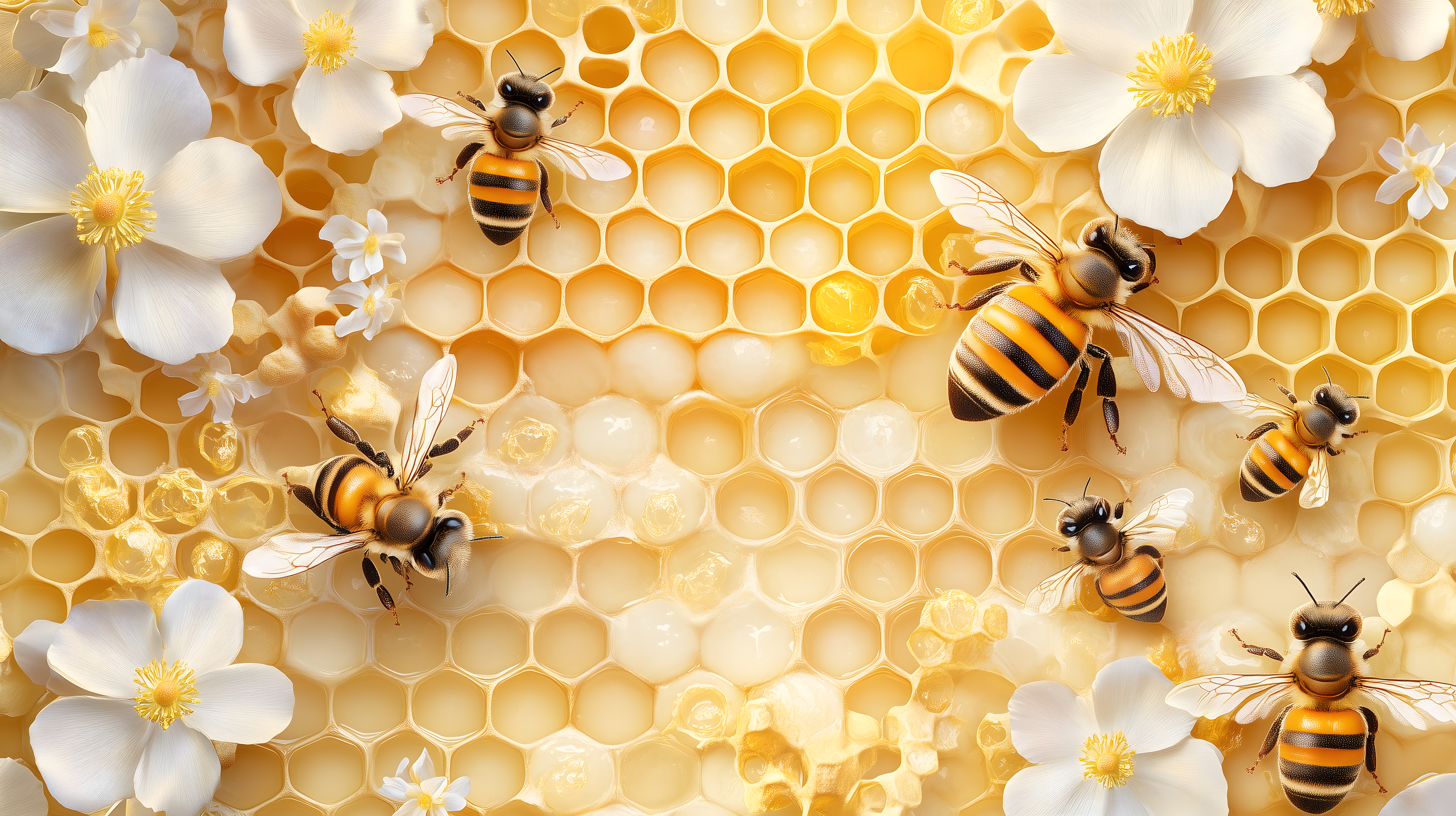 Dieses faszinierende Foto zeigt eine detailreiche Szene aus der Welt der Bienen und Honigwaben. Die goldgelben Waben mit ihren sechseckigen Strukturen sind von mehreren fleißigen Bienen umgeben, die ihrer Arbeit nachgehen. Umrahmt werden die Waben von zarten, weißen Blüten, die eine schöne Kontrast- und Farbharmonie schaffen. Das Bild vermittelt einen Eindruck von Natürlichkeit, Organik und der Schönheit des Bienenhaushalts. Es eignet sich hervorragend als kostenloses Stockfoto für Blogger, Social-Media-Kanäle oder Werbekampagnen rund um Themen wie Nachhaltigkeit, Landwirtschaft oder Imkerei. Die hohe Auflösung und Creative-Commons-Lizenz erlauben eine flexible Nutzung.