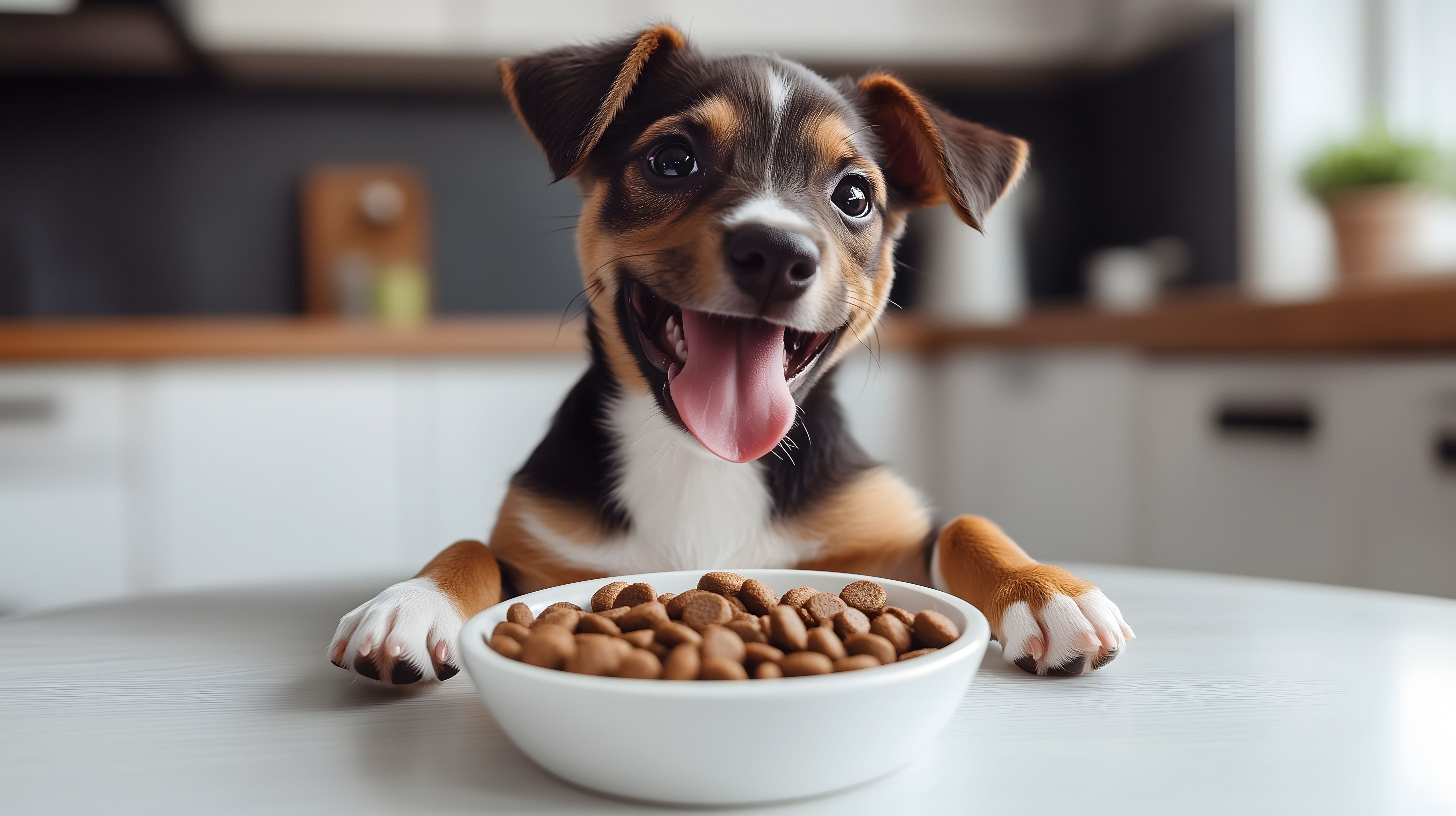 Das Foto zeigt einen glücklichen kleinen Hund, der vor einer Schüssel voller Trockenfutter sitzt. Mit seiner Zunge hängt aus dem Maul und einem freundlichen Gesichtsausdruck scheint der Hund sich sehr über seine Mahlzeit zu freuen. Das Bild ist in natürlichen Farben aufgenommen und hat einen minimalistischen Hintergrund, der den Fokus ganz auf den Hund und seine Futter lenkt. Dieses hochauflösende Stockfoto eignet sich hervorragend für den Einsatz in Blogbeiträgen, Newslettern, sozialen Medien oder Werbematerialien rund um das Thema Haustiere und Tierfutter. Es steht unter einer Creative-Commons-Lizenz zur kostenlosen Verwendung zur Verfügung.
