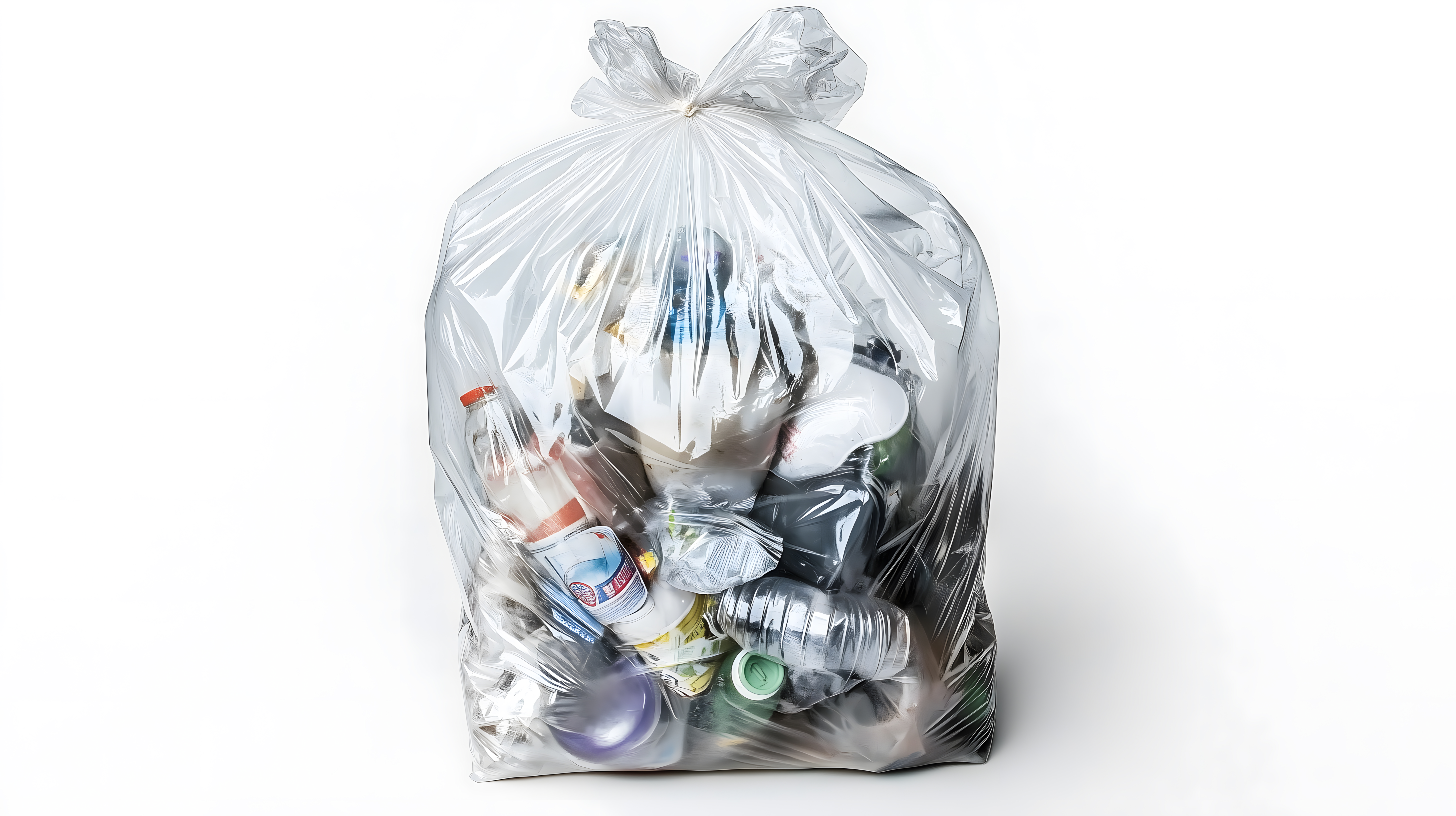 Das Bild zeigt einen durchsichtigen Müllsack, der mit verschiedenen Plastik- und Glasabfällen gefüllt ist. Der Müllsack ist auf einer weißen Oberfläche platziert, wodurch die Transparenz und der Inhalt deutlich sichtbar werden. Die Abfälle umfassen Plastikflaschen, Gläser und andere Verpackungen, die für den Haushaltsgebrauch typisch sind.