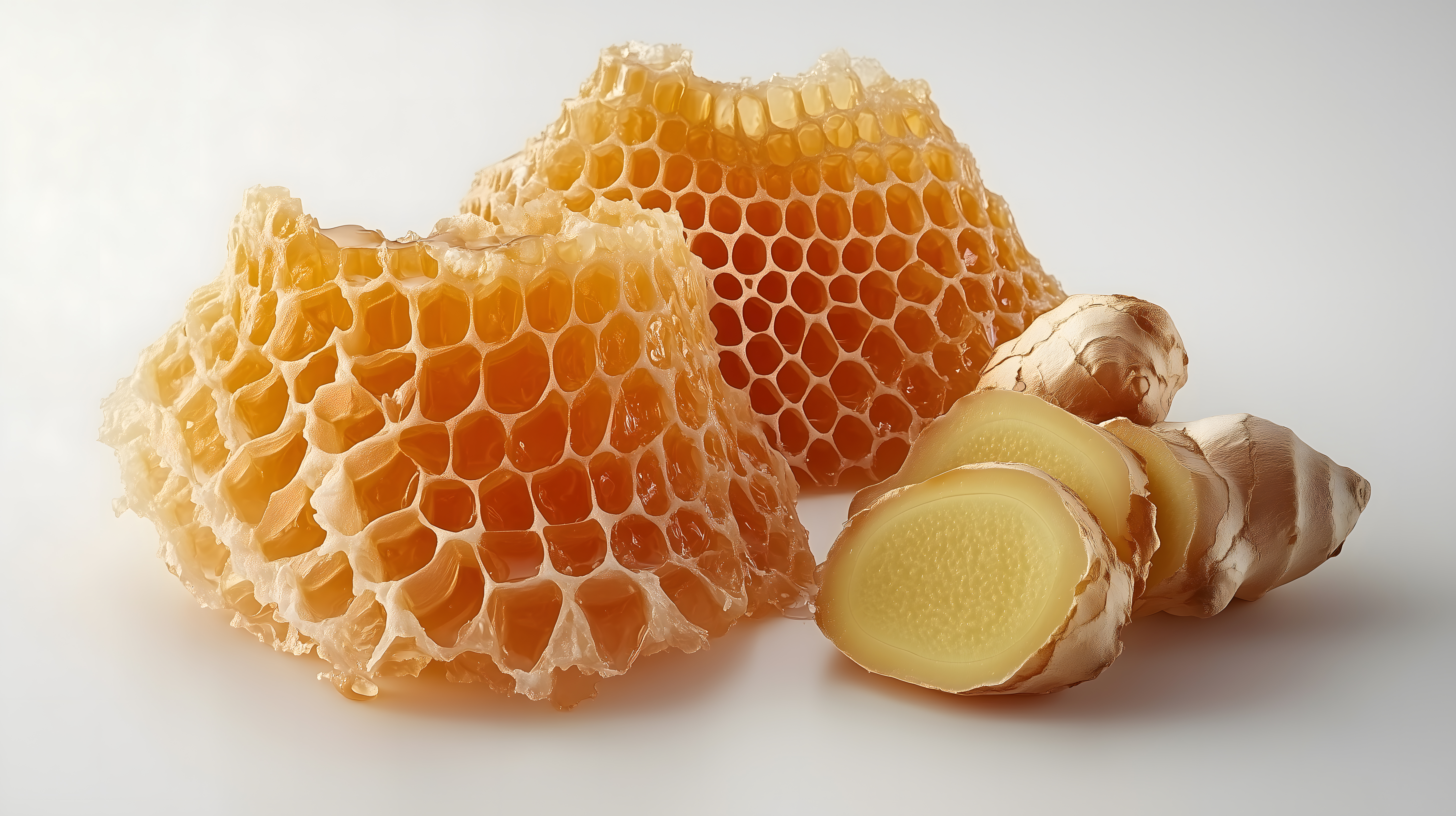 Dieses Foto zeigt eine frische, goldgelbe Honigwabe, die neben einem Stück Ingwerwurzel auf einem hellen Untergrund platziert ist. Die Wabe ist in einer natürlichen, organischen Form mit ihren typischen, sechseckigen Zellen zu sehen. Das Bild strahlt eine reine, unberührte Natürlichkeit aus und lässt die süßen, wertvollen Inhaltsstoffe des Honigs sowie die würzigen Eigenschaften des Ingwers erahnen. Dieses Stockfoto in hoher Auflösung eignet sich perfekt für Blogbeiträge, Werbekampagnen oder Social-Media-Posts rund um gesunde Ernährung, Wellness, Naturkosmetik oder traditionelle Heilmittel. Es steht unter der Creative-Commons-Lizenz kostenlos zum Download zur Verfügung.