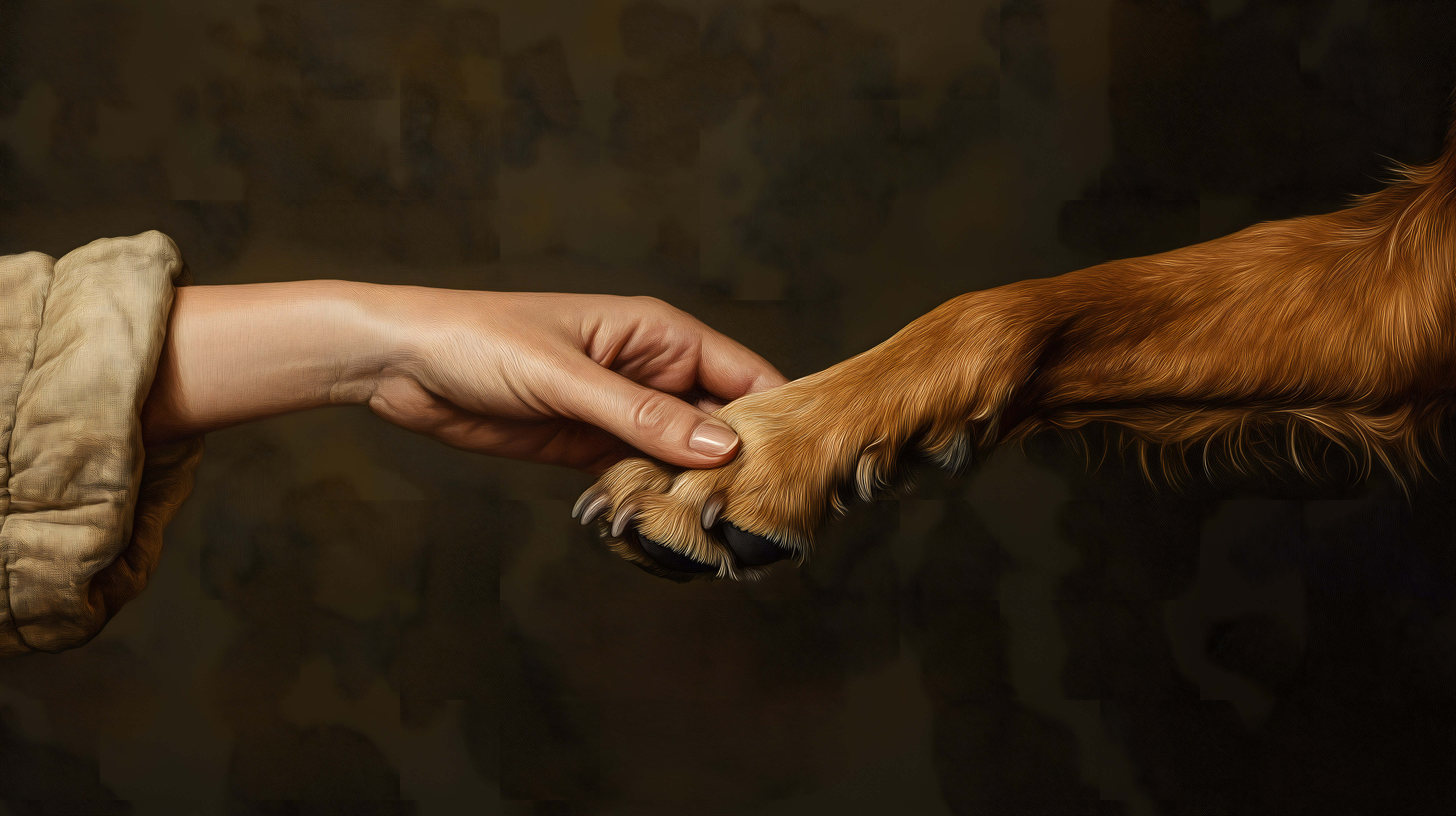 Das Bild zeigt eine liebevolle Szene, in der eine Hand zart die Vorderpfote eines braunen Hundes berührt. Das weiche, lange Hundefell und die sanfte Geste vermitteln ein Gefühl von Vertrauen und gegenseitiger Zuneigung zwischen Mensch und Tier. Das Foto ist in düsterer, warmer Beleuchtung aufgenommen, was der Szene eine ruhige, intime Stimmung verleiht.