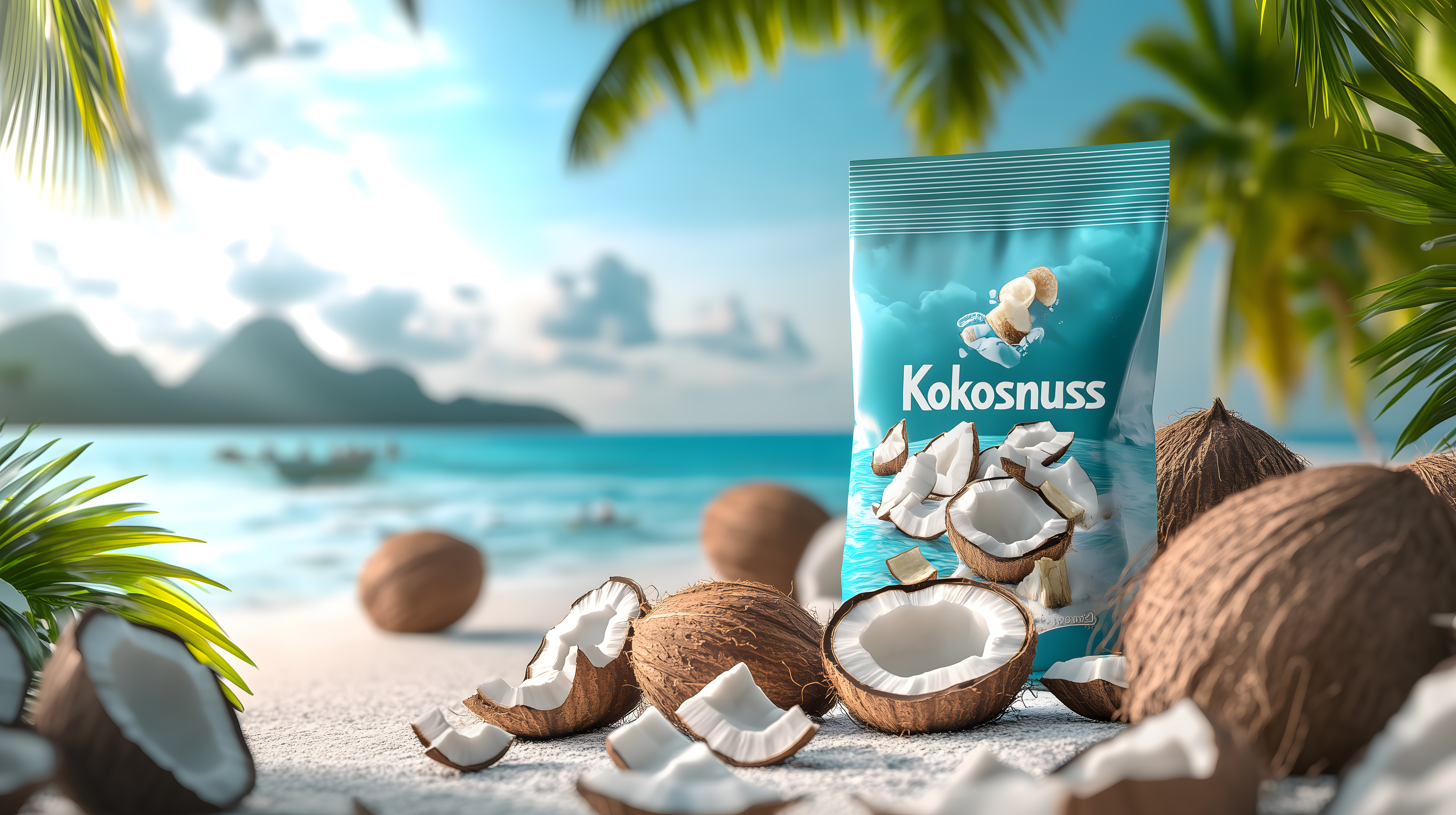 Dieses einzigartige Stockfoto zeigt eine verlockende Szene am tropischen Strand: Mehrere frische Kokosnüsse liegen im Sand, umgeben von Palmenblättern und einem traumhaft blauen Ozean im Hintergrund. Eine hochwertige Produktverpackung für 'Kokosnuss' unterstreicht den Fokus auf dieses sommerliche Superfood. Das Foto eignet sich perfekt für Werbung, Blogs oder Social-Media-Beiträge rund um Reisen, Ernährung, Naturkost oder Urlaubsstimmung. Die hochauflösende Datei steht unter einer kostenlosen Creative-Commons-Lizenz zur Verfügung.