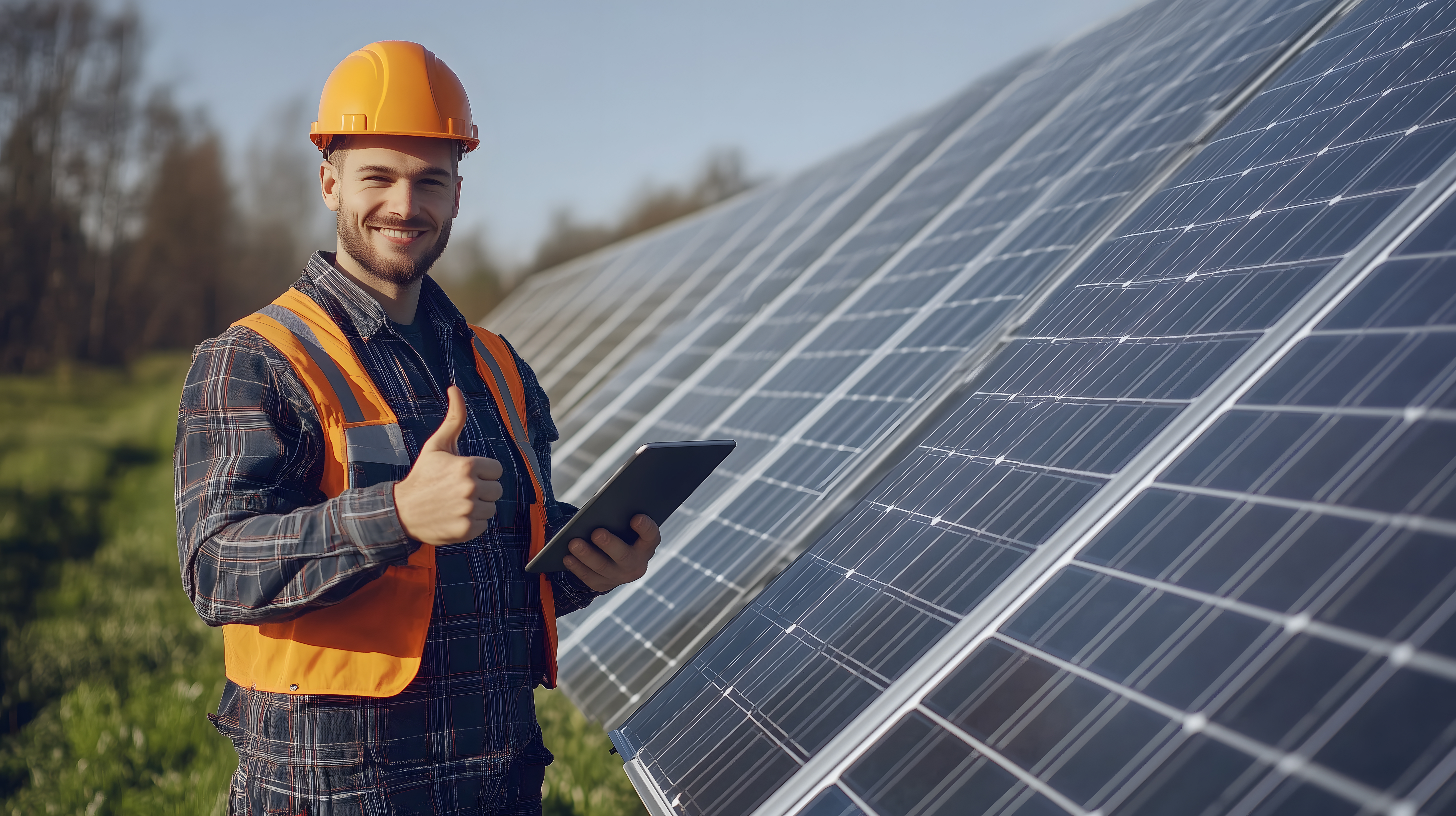 Das Bild zeigt einen Solartechniker, der vor einer Reihe von Solarmodulen steht und ein Tablet in der Hand hält. Mit einem Daumen hoch und einem Lächeln im Gesicht scheint er zufrieden mit der Begutachtung der Photovoltaikanlagen zu sein. Die Szene vermittelt Professionalität, Umweltfreundlichkeit und den Einsatz für erneuerbare Energien. Dieses kostenloses Stockfoto in hoher Auflösung unter Creative Commons-Lizenz eignet sich hervorragend für Blogbeiträge, Werbekampagnen oder Newsletter zum Thema Solarenergie, Nachhaltigkeit und Klimaschutz.