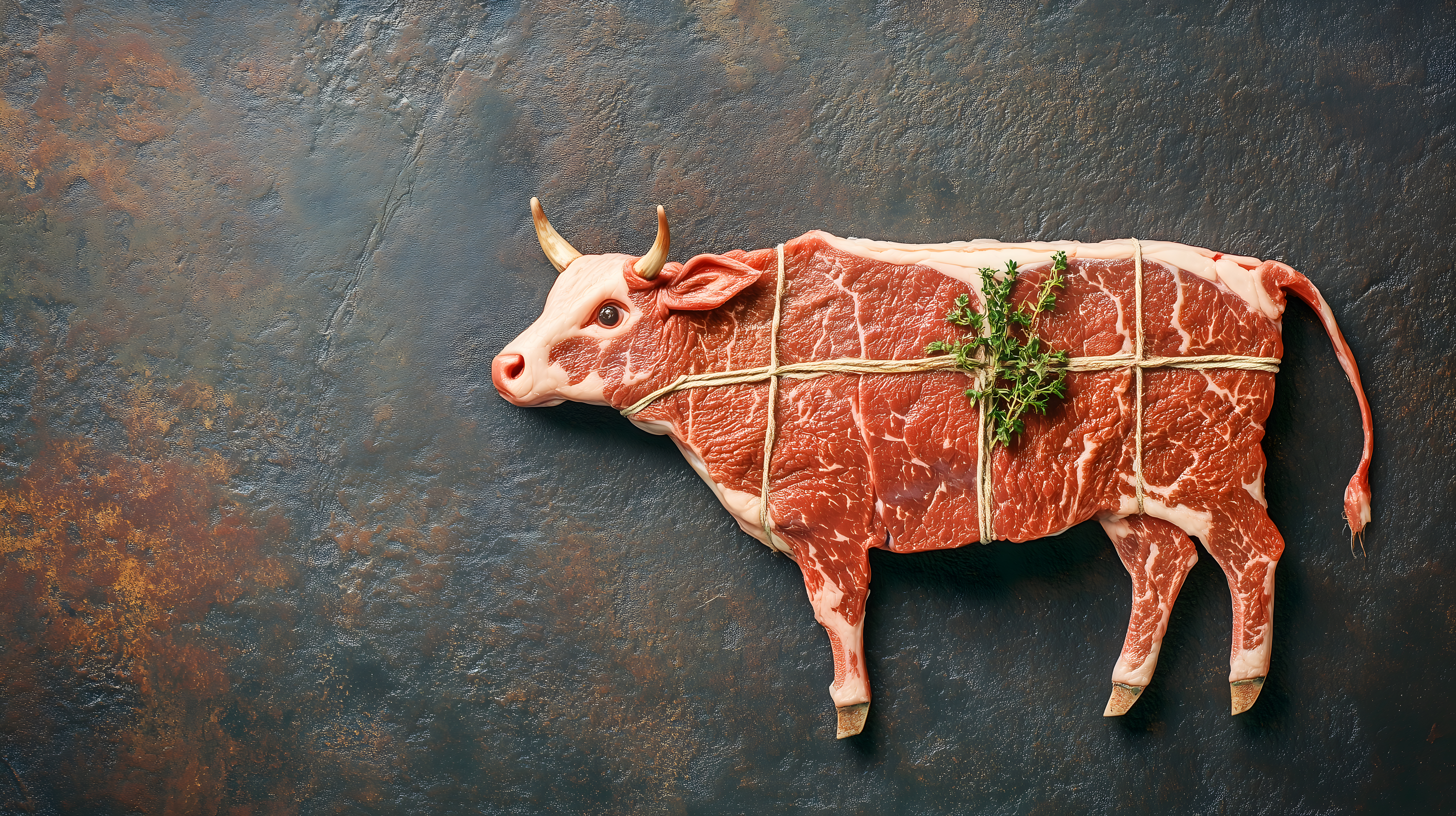 Dieses Foto zeigt ein Stück Rindfleisch in Form einer Kuh auf einem dunklen, rustikalen Hintergrund. Das Fleisch ist in Scheiben geschnitten und mit Kräutern wie Thymian dekoriert, was dem Bild eine natürliche und appetitliche Optik verleiht. Der Kontrast zwischen dem roten Fleisch und dem dunklen Schieferstein-Hintergrund schafft eine stimmungsvolle Atmosphäre.