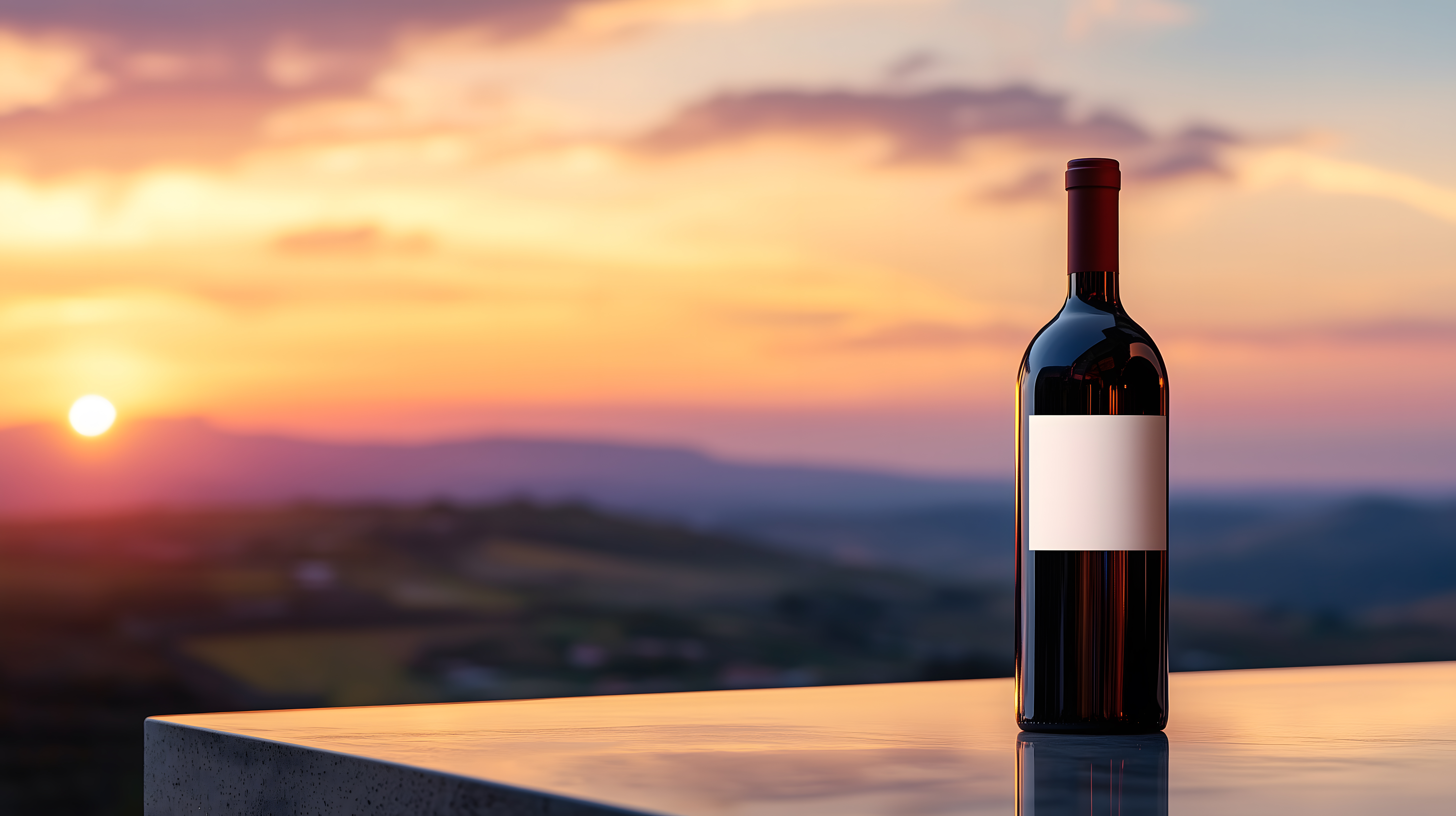 Dieses eindrucksvolle Foto zeigt eine Flasche Rotwein vor einer atemberaubenden Sonnenuntergangsszenerie. Im Vordergrund ist eine elegant gestaltete Weinflasche mit einem roten Etikett platziert, die sich auf einer Oberfläche spiegelt. Im Hintergrund erstreckt sich eine malerische Berglandschaft, deren Gipfel in warmen orangefarbenen und rötlichen Tönen des Sonnenuntergangs getaucht sind. Der Himmel leuchtet in einem dramatischen Farbspiel aus Gelb, Orange und Violett. Diese Szene vermittelt ein Gefühl von Entspannung, Genuss und Premium-Qualität, ideal für den Einsatz in Werbekampagnen, Weinblogs oder Social-Media-Beiträgen rund um das Thema Wein und Weinkultur. Das Foto ist in hoher Auflösung verfügbar und unter einer Creative-Commons-Lizenz nutzbar.