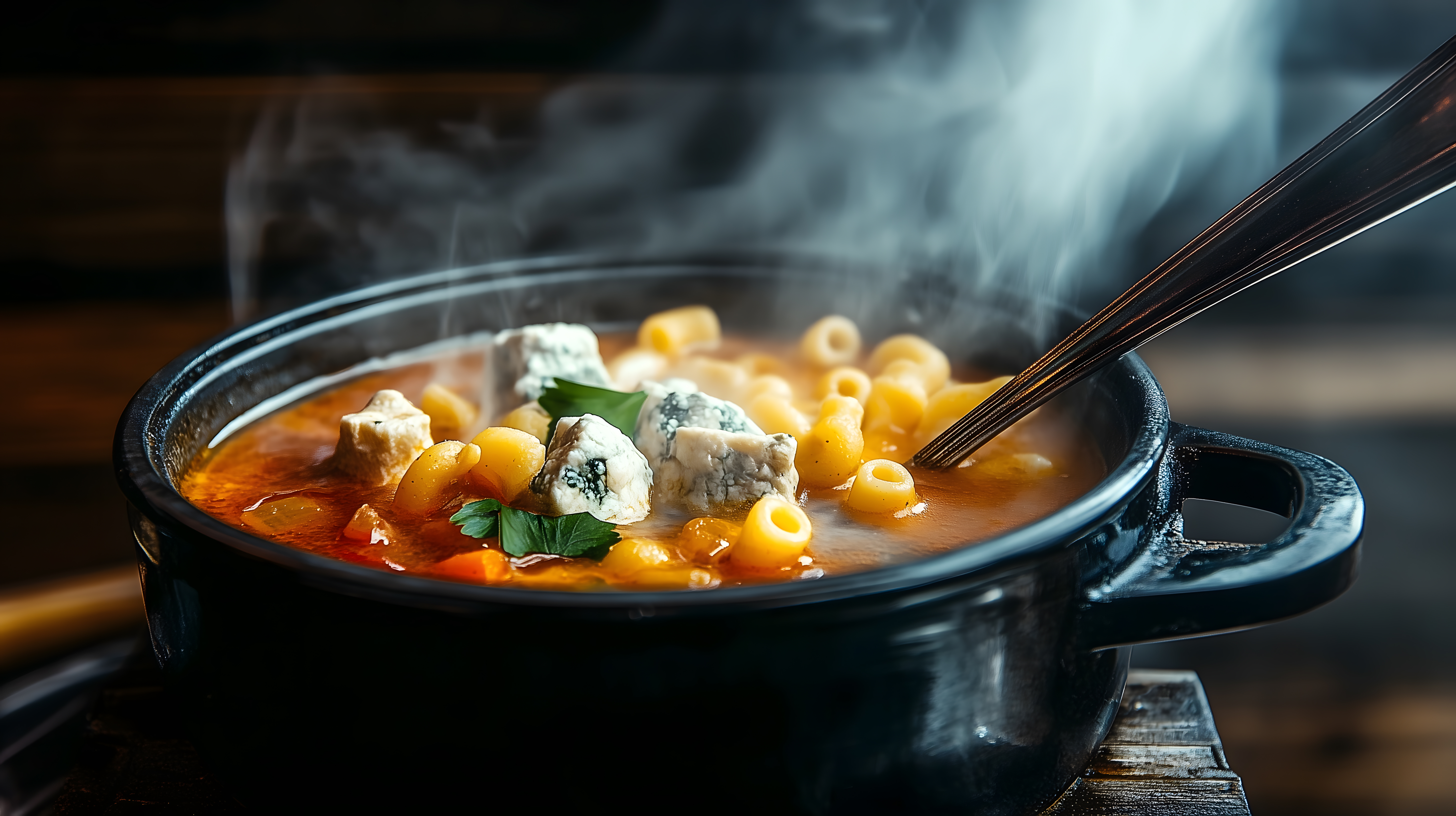 Das Bild zeigt eine dampfende, köstliche Gemüsesuppe in einer rustikalen Schüssel auf einem Holztisch. Die Suppe ist mit Nudeln, Blauschimmelkäse und frischen Kräutern angereichert und verströmt einen verführerischen Duft. Die Dampfschwaden und die warme Farbgebung der Suppe erzeugen eine einladende, gemütliche Stimmung. Dieses Stockfoto eignet sich hervorragend für Rezeptblogbeiträge, Social-Media-Posts oder Werbematerial für Kochkurse und Wintergerichte. Es ist in hoher Auflösung verfügbar und unter einer Creative-Commons-Lizenz kostenfrei nutzbar.